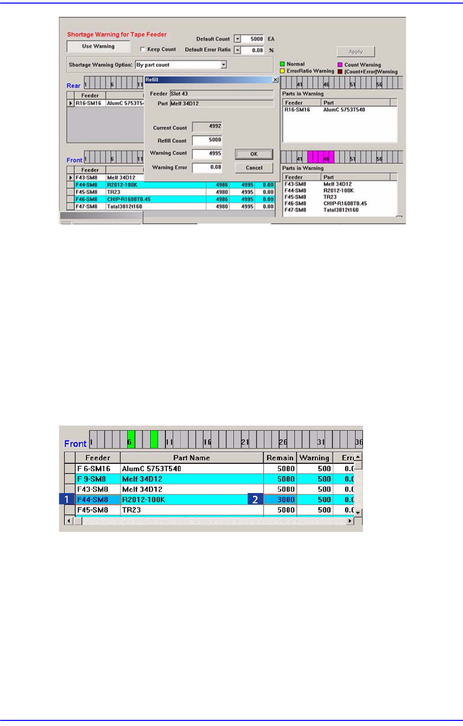 11-14 Samsung Component Placer SM 411F/411FN Administrator ’ s Guide T ape Feeder Mon itor 댑 대화상자의 <De fault Count> 콤보박스와 <Default Error Ratio> 콤보박스에서 설정한 값이 적 용되어 있습니다 . <OK> 버튼을 클릭하면 <Refill Count&…