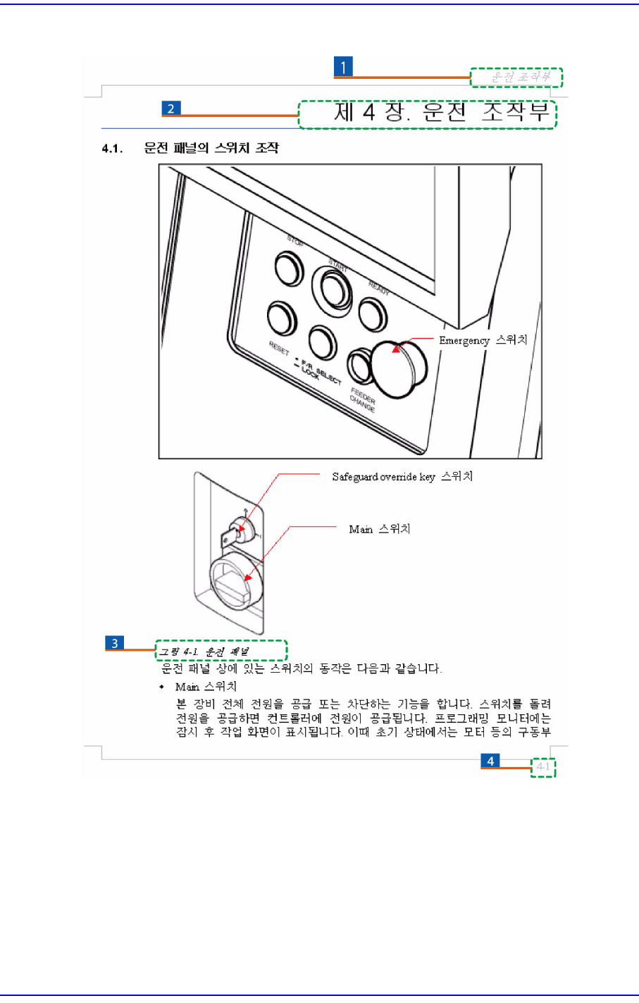 머리말 xv Page Layout 1: 장 제목 / 매뉴얼 이름 2: 장 제목 3: 그림 ( 장번호 )-( 그림순서 ).( 그림제목 ) 4 장의 첫 번째 그림이며 , 그림의 제목이 운전패널 임을 나 타냅니다 . 4: 장 번호 - 페이지 (4 장의 첫 페이지를 의미합니다 )