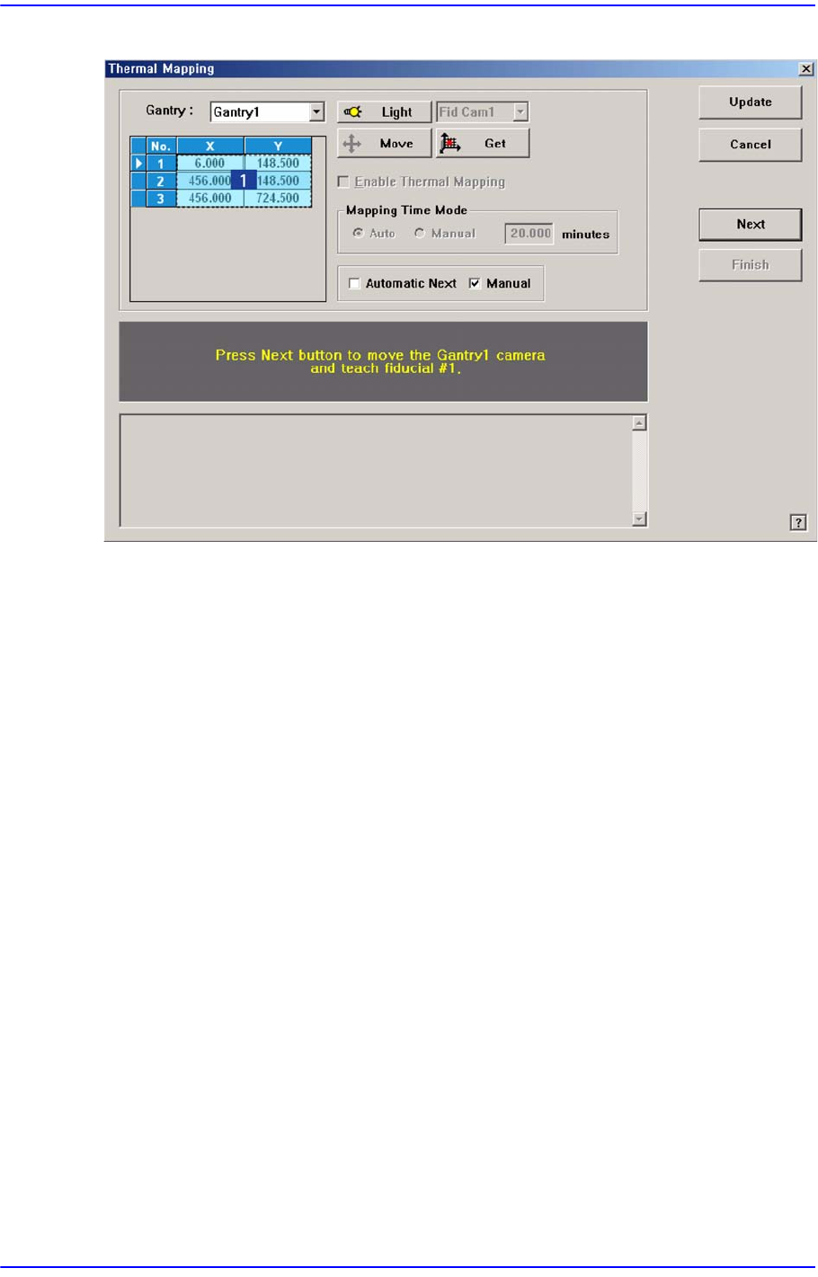 12-35 Machine Calibration 이 체크박스를 선택하고 <Next> 버튼을 클릭하 면 자동으로 Gantry Thermal Mapping 과정을 수행합니다 . <Manual> 체크박스 티칭박스를 사용하여 각 Gantry 를 지정된 위치로 이동시켜서 Gantry Ther mal Mapping 과정을 수동으로 수행합니다 . 12.3.7.1. Procedure…