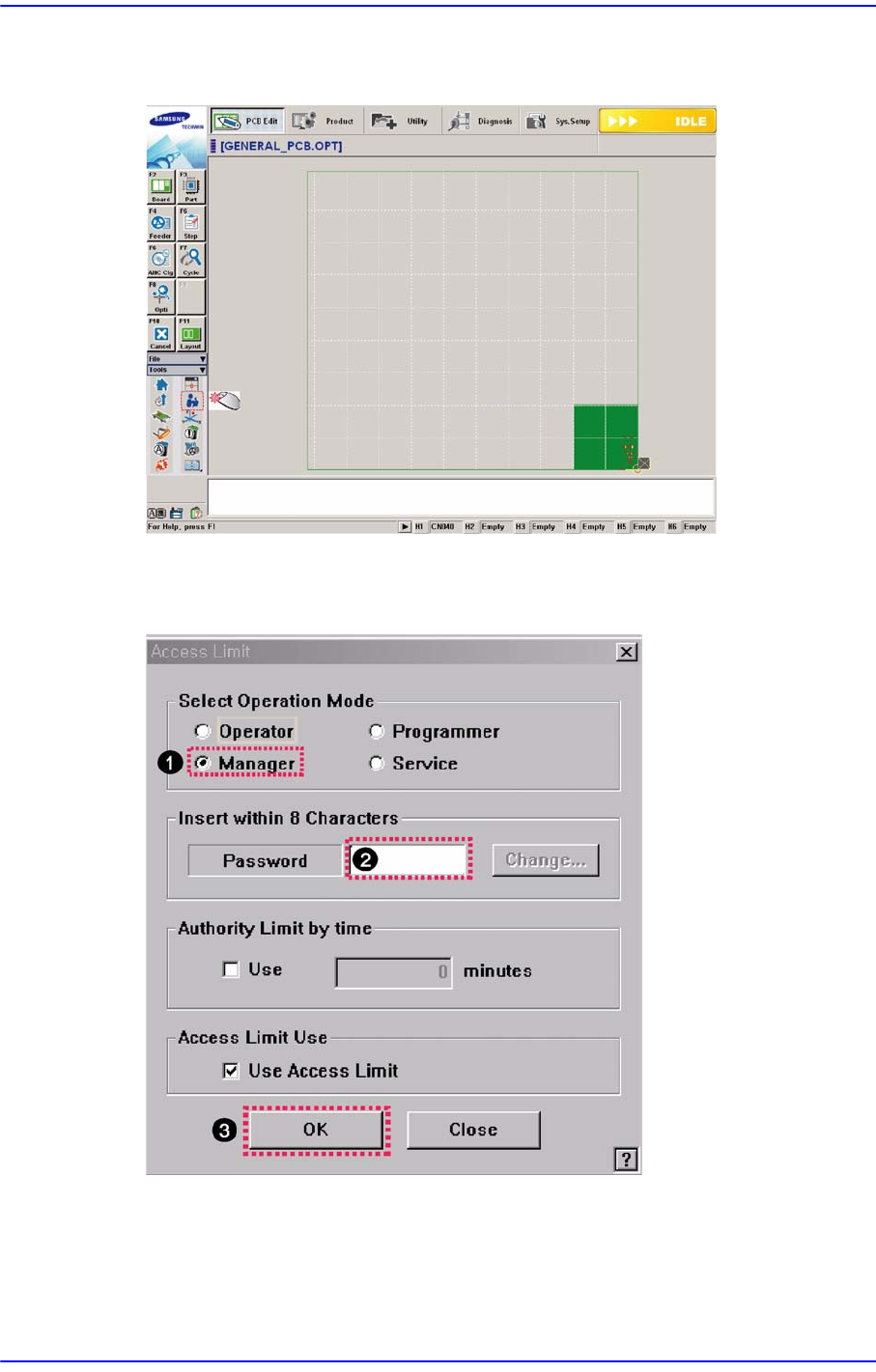 1-2 Samsung Component Placer SM 411F/411FN Administrator ’ s Guide 사용자모드를 선택하고 , 사용자를 관리하기 위한 대화상 자를 실행하려면 , MMI 의 T ools 하위메뉴에서 'Operation Mode ' 버튼을 클릭하십시오 . 사용자 모드 설정 그림 1.1 사용자 모드 설정 <Select Operatio…