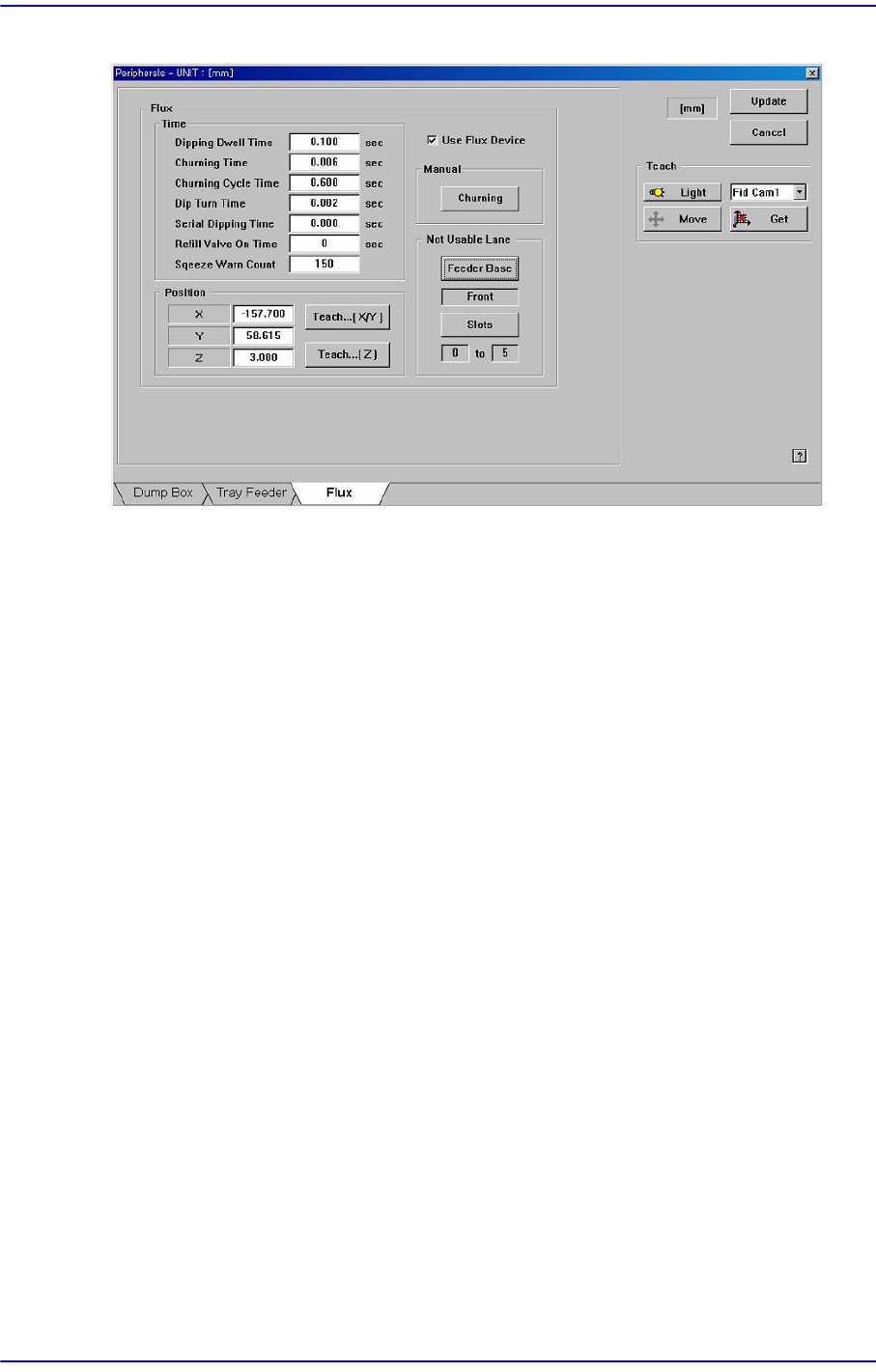 13-16 Samsung Component Placer SM 411F/411FN Administrator ’ s Guide 그림 13.9 “ Tray Feeder ” 탭 대화상자 <T ime> 영역 우측의 <Use Flux Device> 체크박스가 선택되었을 때 , 활 성화됩니다 . F lux Module 의 동작과 관련된 사항을 설정합니다 . <Dippin…