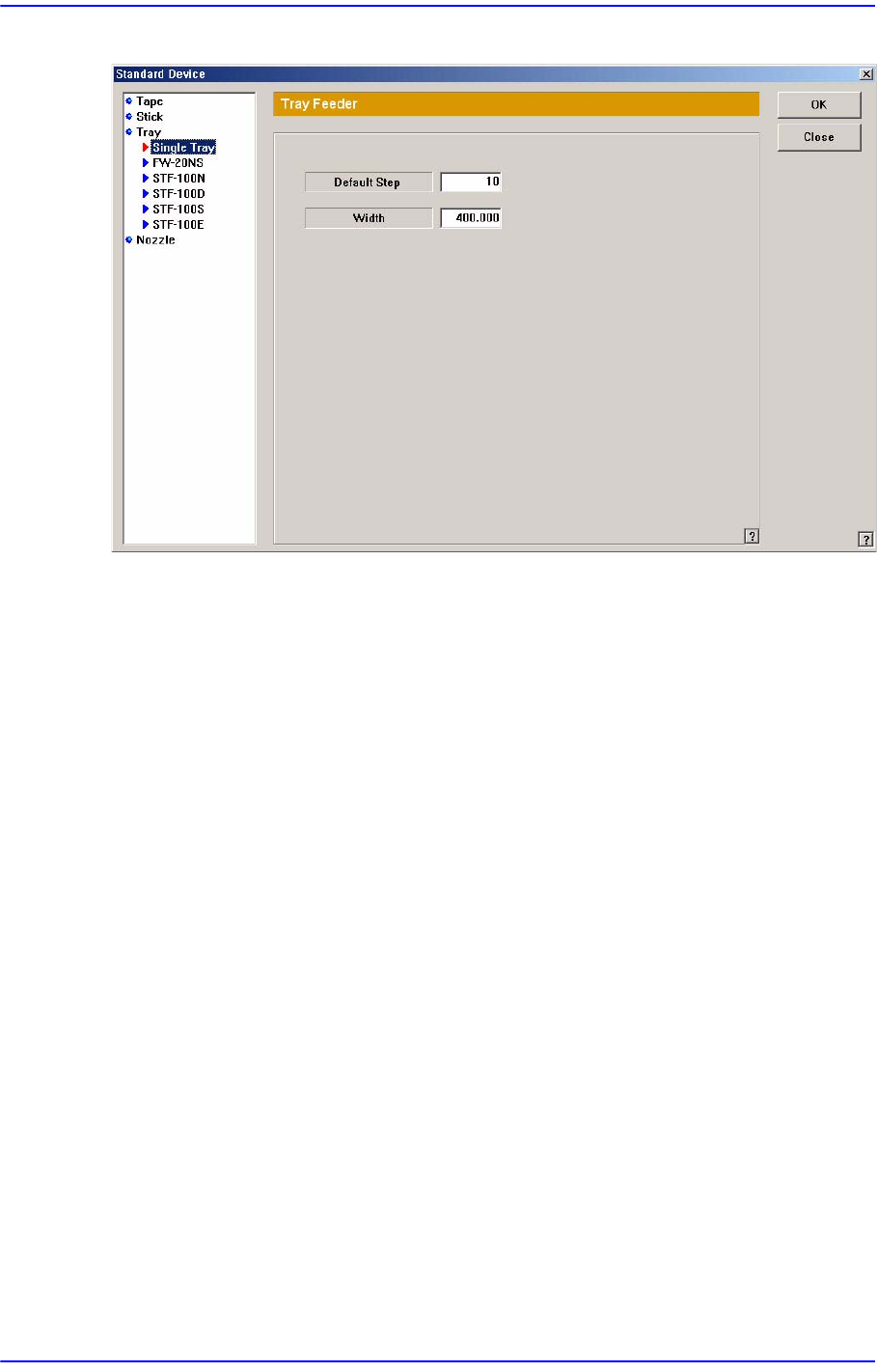 13-34 Samsung Component Placer SM 411F/411FN Administrator ’ s Guide 그림 13.16 “ Standard Device – Tray ” 대화상자 리스트박스 설정할 Tra y T y p e 을 선택합니다 . <Default Step> 에디트박스 T ray Feeder T ype 에 따른 각 Tray Feeder 들의 기본 T…