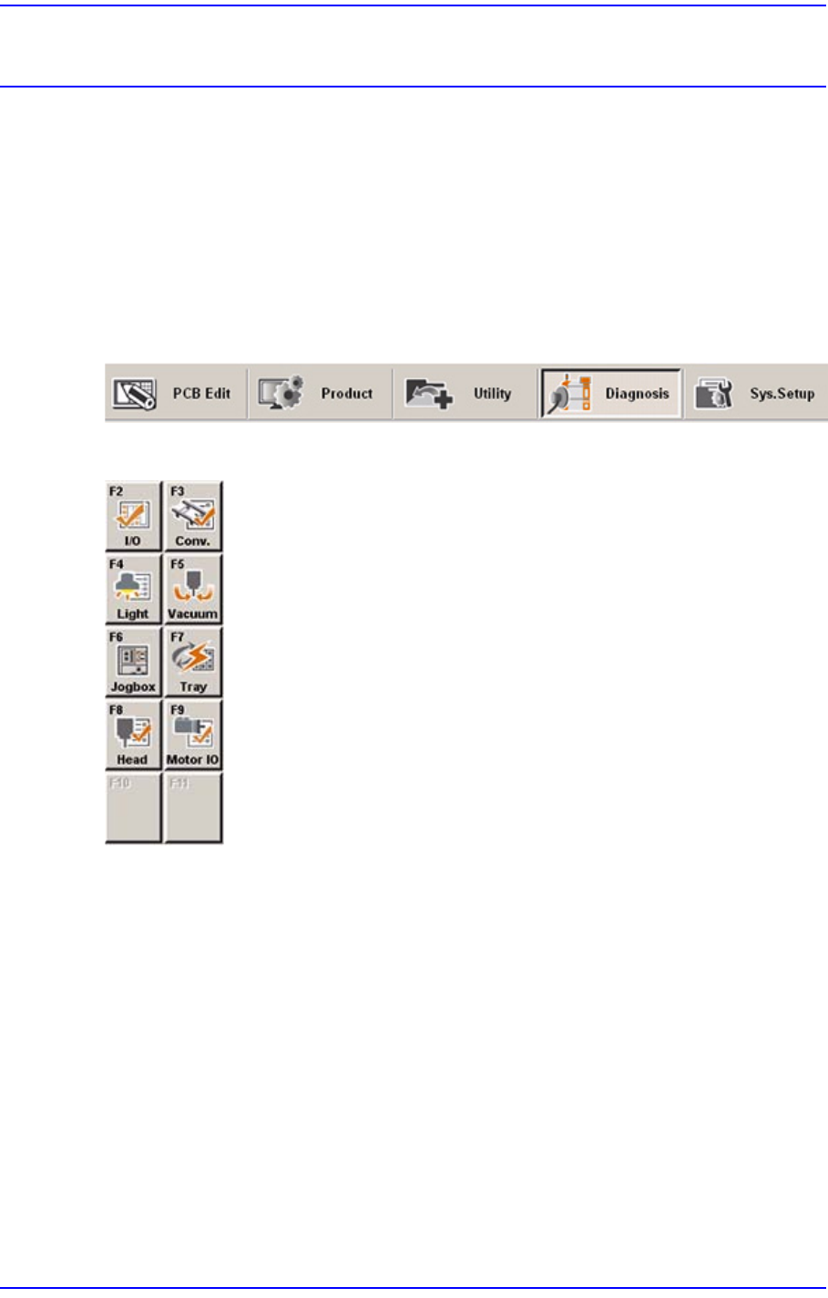 <Diagnosis> 메뉴는 I/O, Conveyor, Light, Vacuum, Jogbox, Tray, Head, Motor IO 등의 8