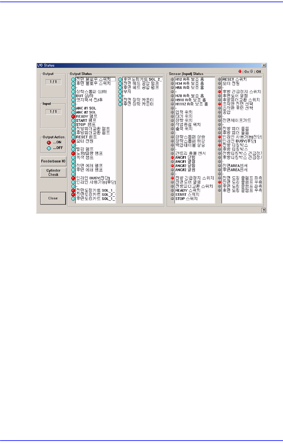 14-2 Samsung Component Placer SM 411F/411FN Administrator ’ s Guide 14.1. I/O [F2] <I/O> 메뉴는 장비의 각종 I/O ( 입력 / 출력 ) Sensor 의 상태를 설정하거나 표 시합니다 . 그림 14.3 “ /O Stat us ” 대화상자 <Output> 영역 출력 장치들의 상태를 표시합니다 . …