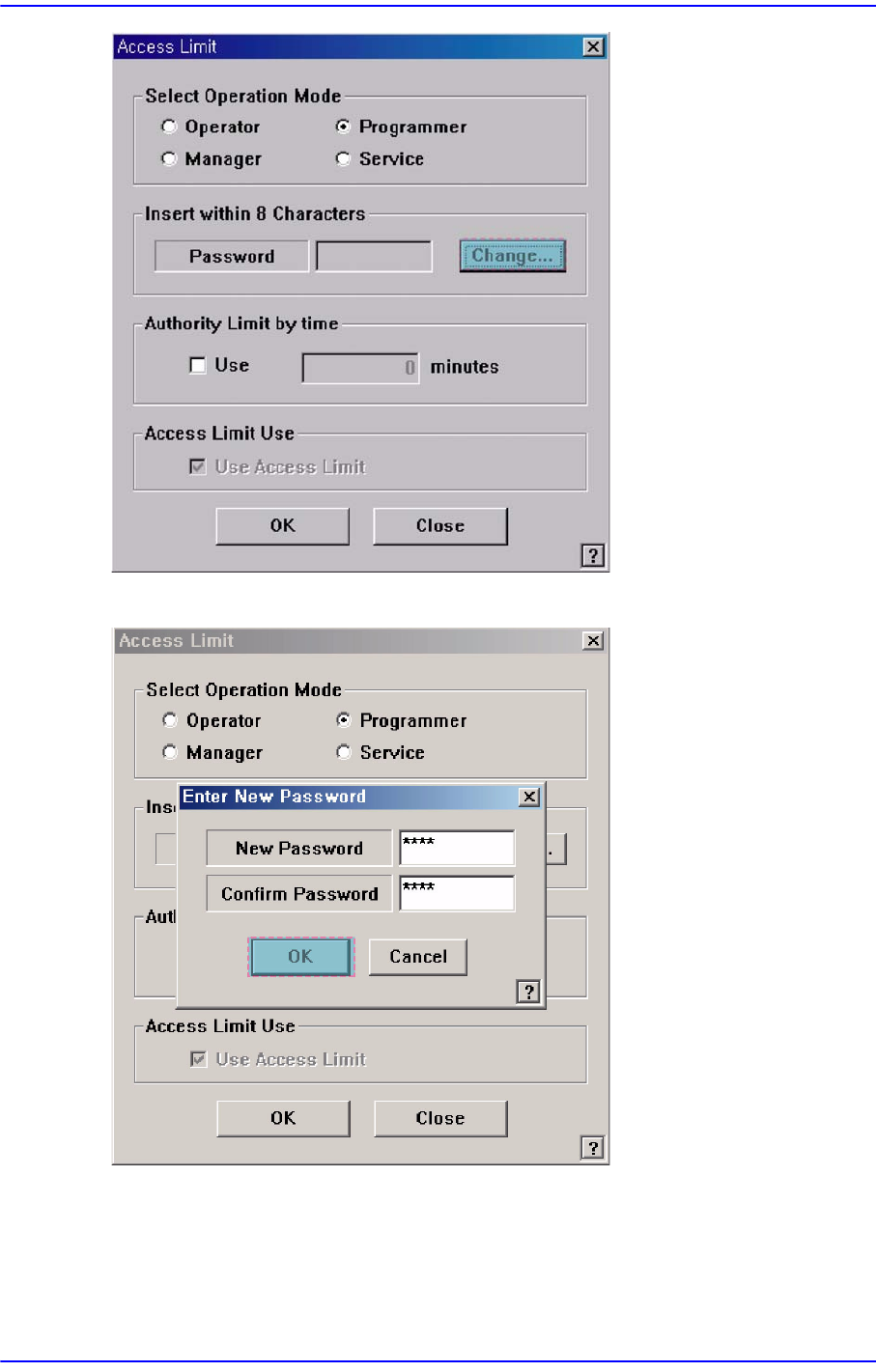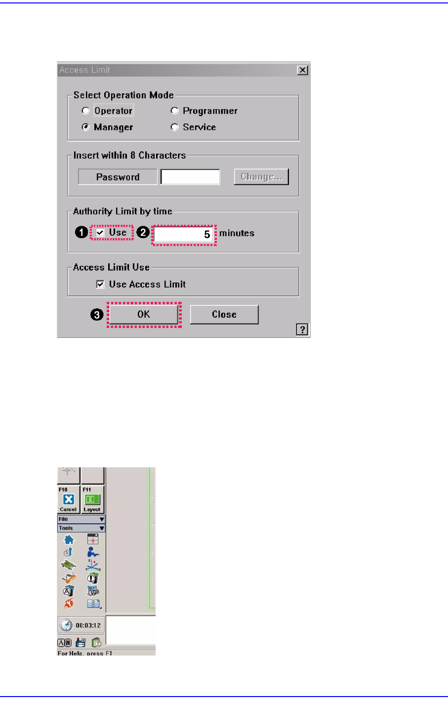 1-11 운영모드 및 패스워드변경 1.3. 사용자 로그인 시간 설정 설정된 시간 후 사용자 모드가 자동으로 'Operator' 로 전환되도 록 합니다 . 설정하는 방법은 다음과 같습니다 . <Authority Limit by time> 영역에서 <Use> 체크박스를 선택 에디트 박스에 설 정하려는 시간을 분 단위로 입력 <OK> 버…
