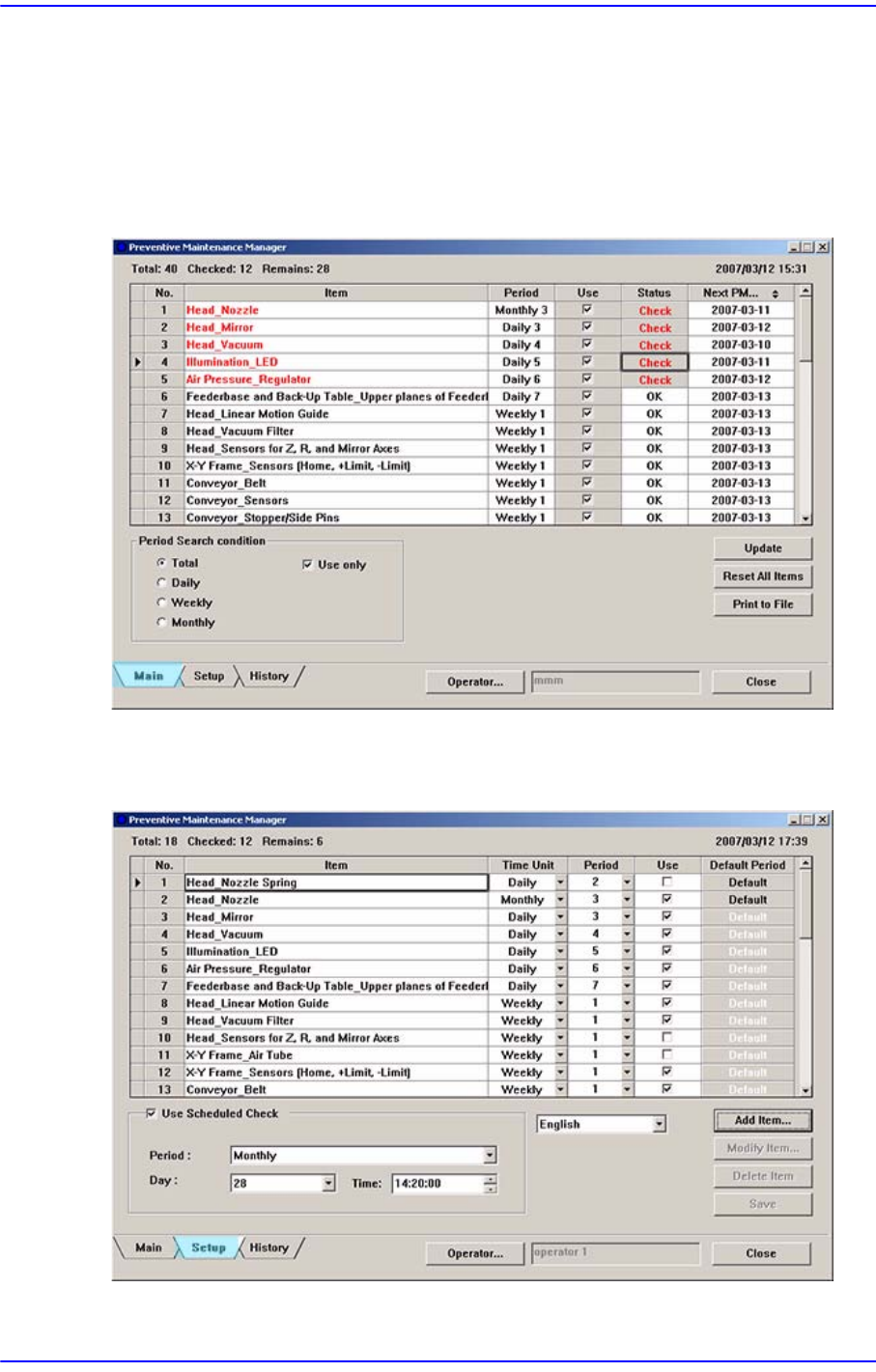 PM Manager는 Main화면, Setup 화면, History 화면으로 구성됩니다. PM Manager를
