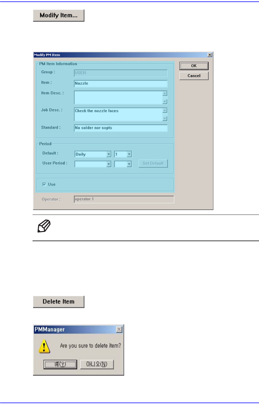 17-12 Samsung Component Placer SM 411F/411FN Administrator ’ s Guide 등록된 점검 항목을 수정함 그림 17.12 사용자 점검항목 수정하기 메 모 사용자 점검항목이 아닌 기본 점검항목은 수정할 수 없습니다 . 17.5.6. 사용자 점검항목 삭제하기 등록된 사용자 점검항목을 삭제할 수 있습니다 . 방법은 다음과 같 습니다 . <D…