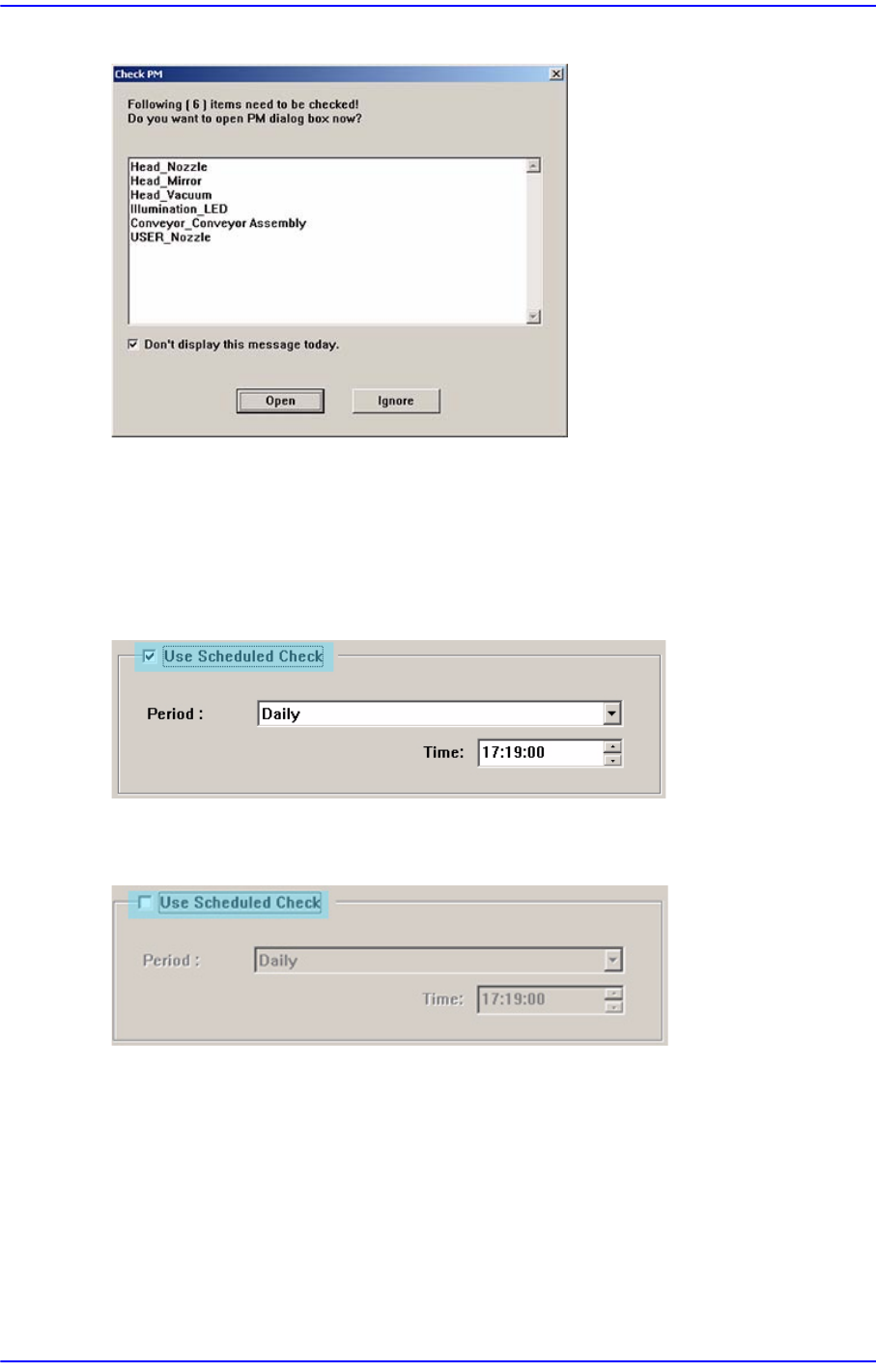 17-14 Samsung Component Placer SM 411F/411FN Administrator ’ s Guide 그림 17.13 예약점검 알림화면 <Open> 버튼을 클릭하면 점검항목을 조치할 수 있도록 PM Manager 창을 표시하고 , <Ignore> 버튼을 클릭하면 PM Manager 창을 표시하지 않습니다 . 17.5.8.1. 예약점검기능 사용 예약점…