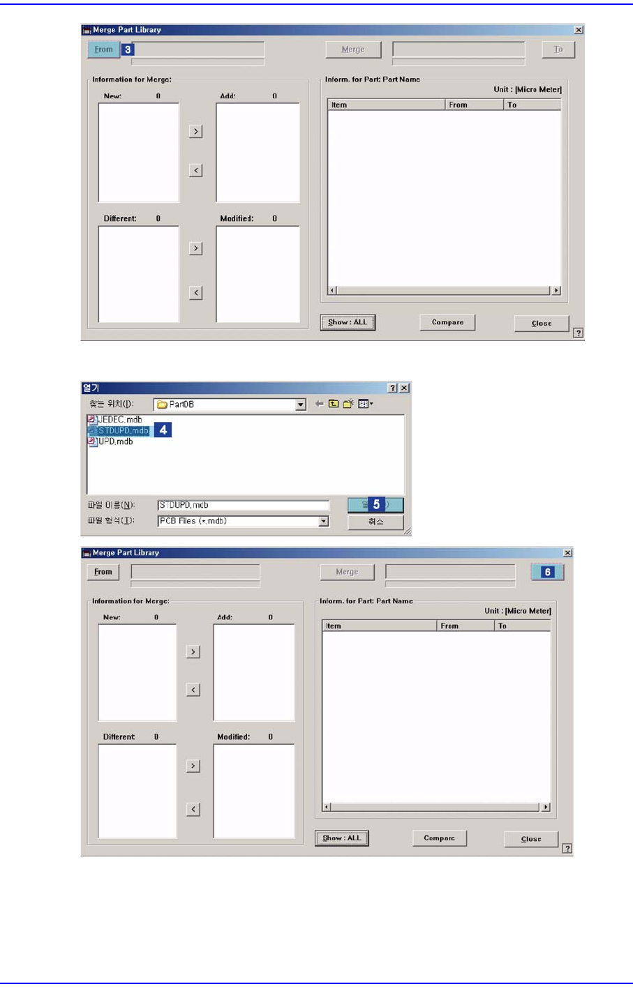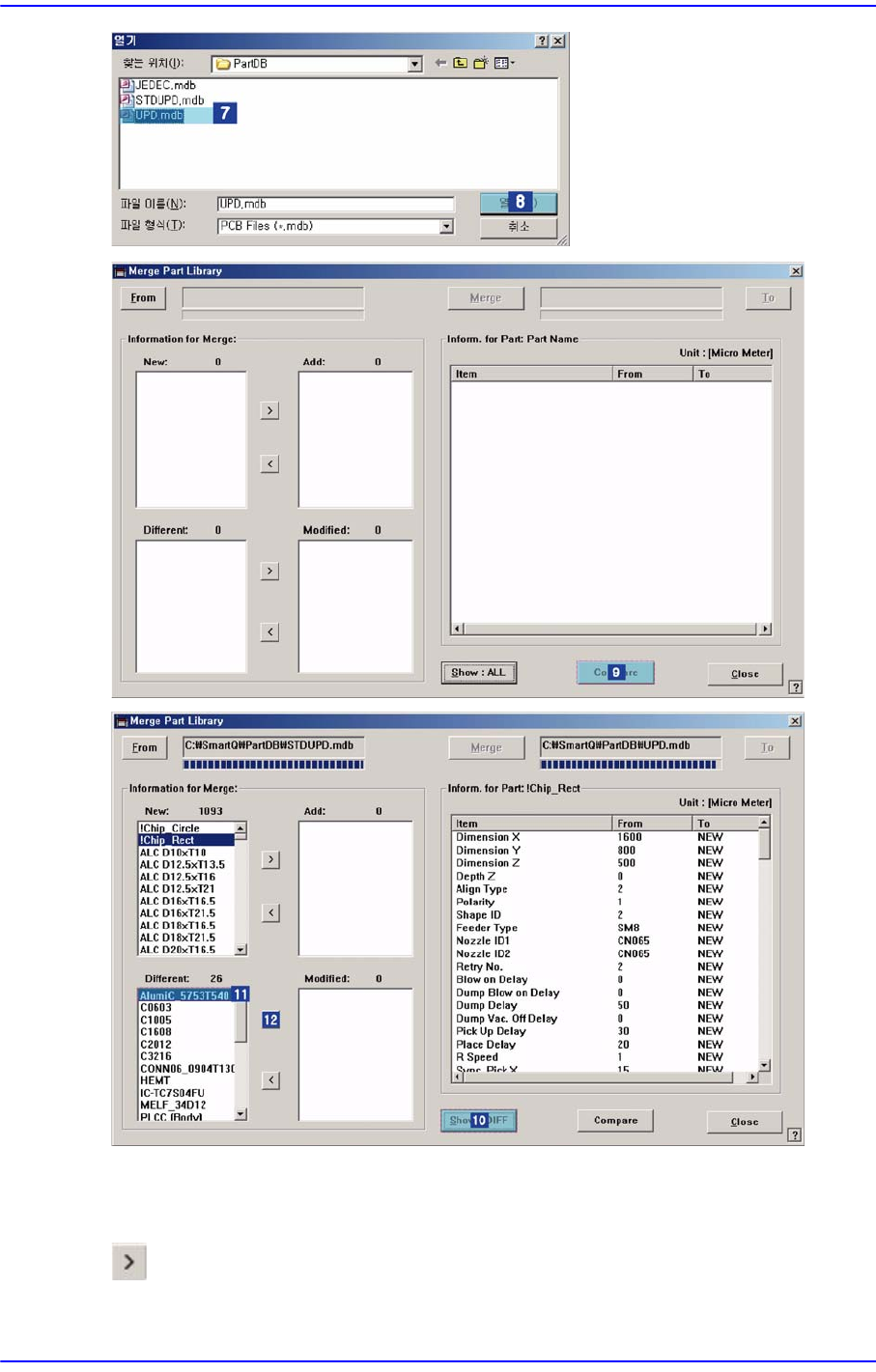 3-14 Samsung Componen t Placer SM411F/411FN Administrator ’ s Guide 부품 정보가 다른 항목들을 비교해서 살펴보기 위해서 <Show : ALL> 버튼 클릭 <New:> 리스트 박스 또는 <Different:> 리스트박스에서 병합할 부품명을 선택 버튼을 클릭해서 <Add:> 리스트박스 또는 <M…