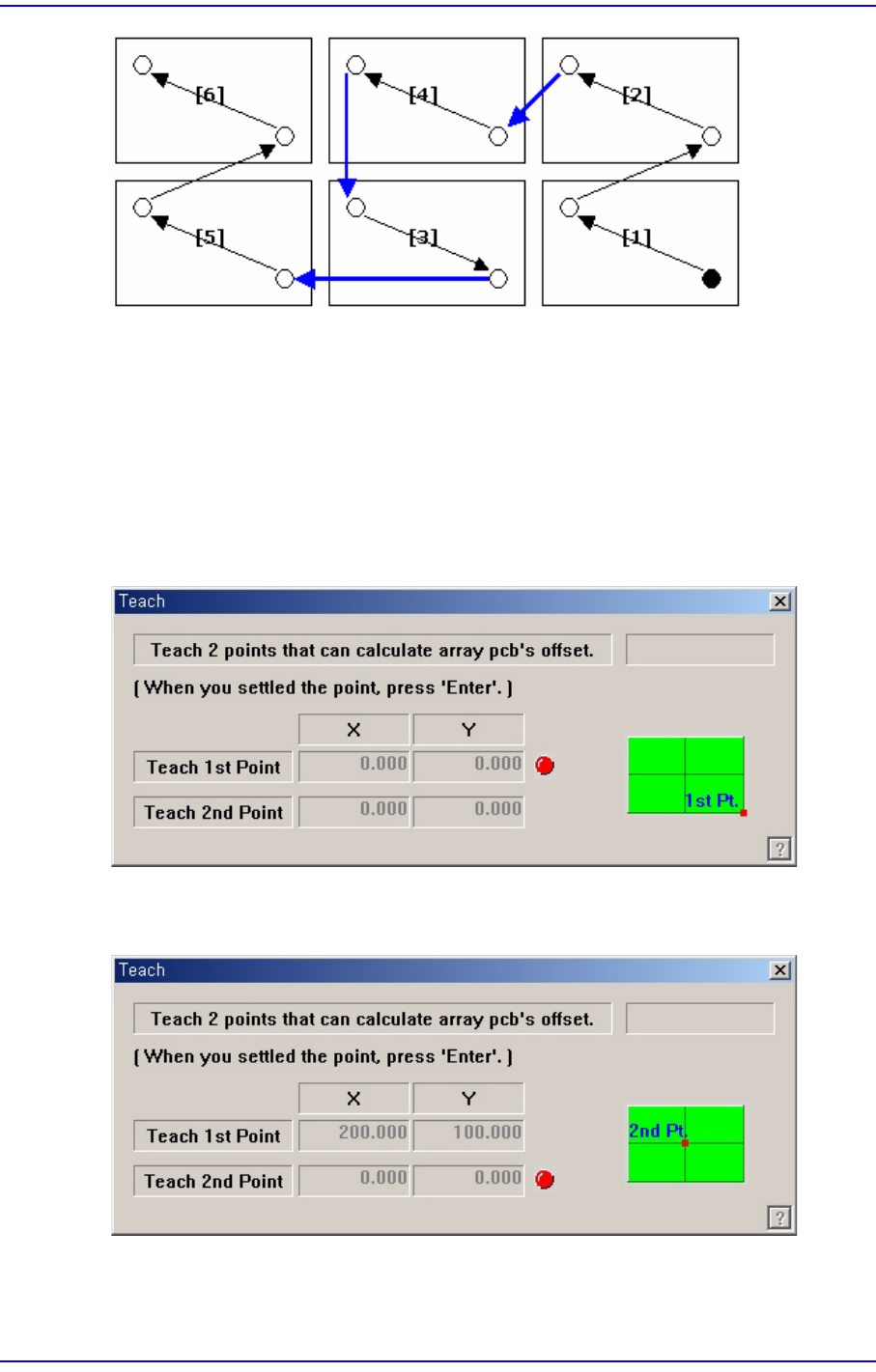 Array PCB 오프셋을 티칭합니다. 이 버튼을 클릭하면 다음의 화면을 순차적으