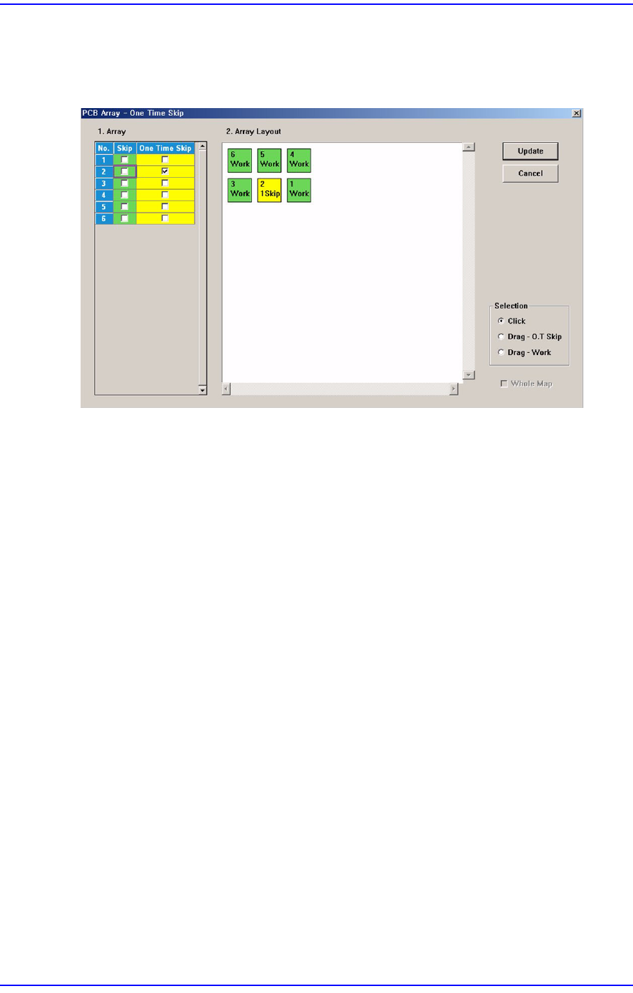 도록 해 주며, <2. Array Layout> 영역에 보이는 소형 PCB의 설정상태를 ‘Skip’