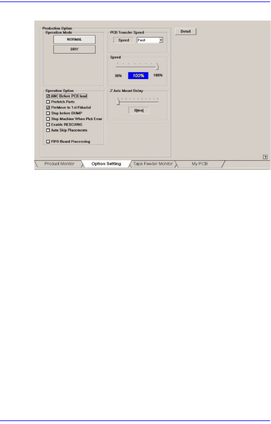 11-7 Production Setup 그림 11.4 “ Option Setting ” 탭 대화상자 <Operation Mode> 영역 작동 Mode 를 설정합 니다 . 선택 가능한 Mode 는 다음과 같습니다 . Normal 모드 실제 부품의 흡착 및 장착 작업을 수행합니다 . Dry 모드 실제 부품의 흡착 및 장착을 하지 않고 아래와 같은 가상조건을 선택해서 작업 을…