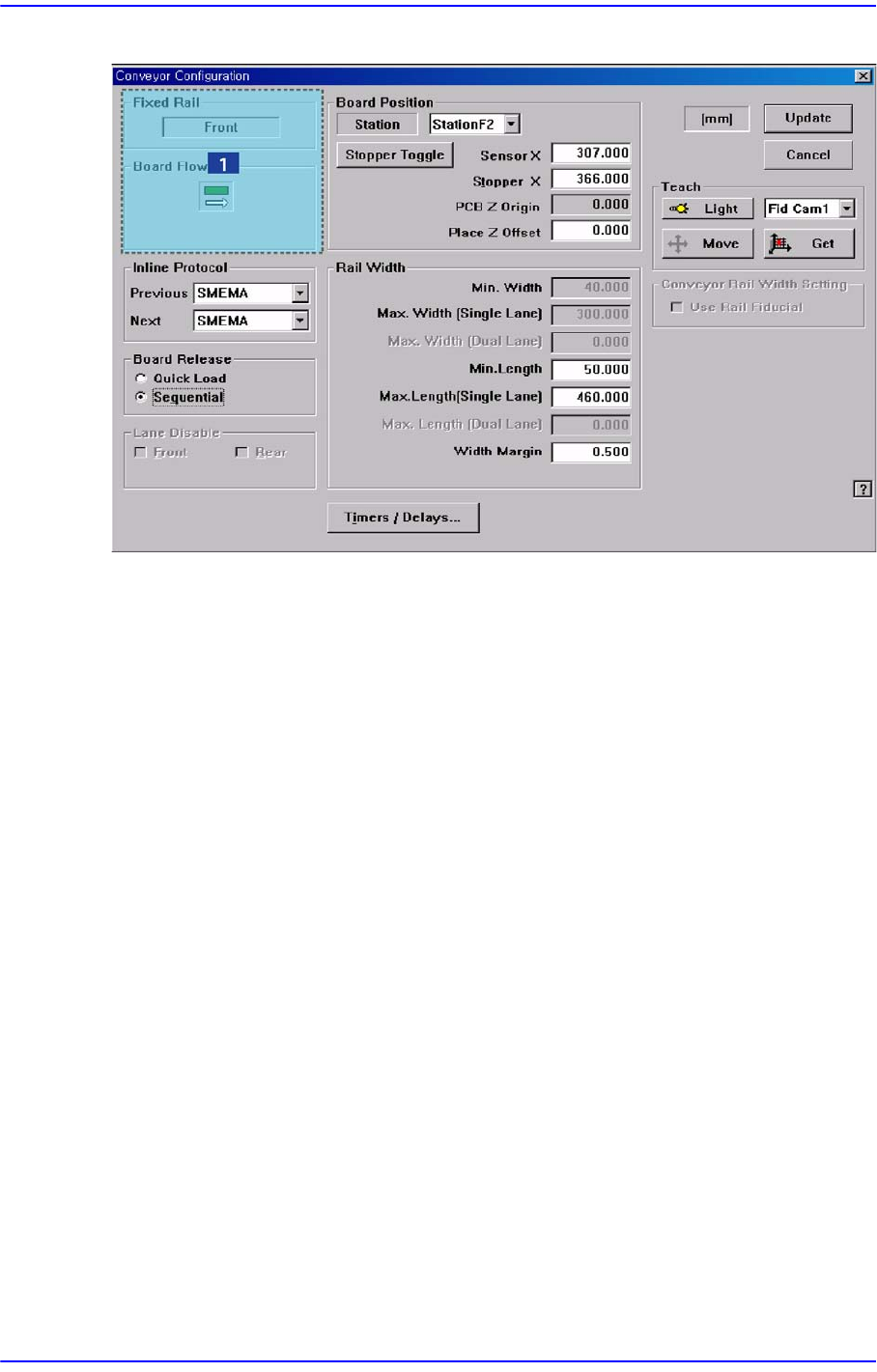 13-2 Samsung Component Placer SM 411F/411FN Administrator ’ s Guide 그림 13.3 “ Conveyor Cofiguration ” 대화상자 1: Current De fine <Current Define> 영역 현재 Conveyor 의 설정 상태를 나타냅니다 . Fixed Rail Conveyor 의 고정 타입 ( 전 / 후…