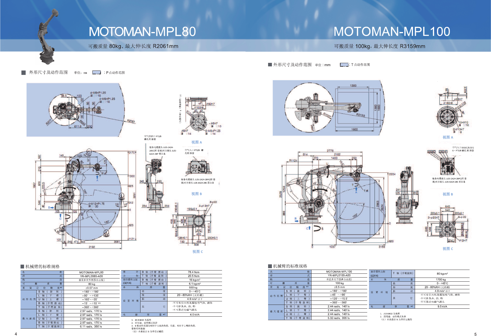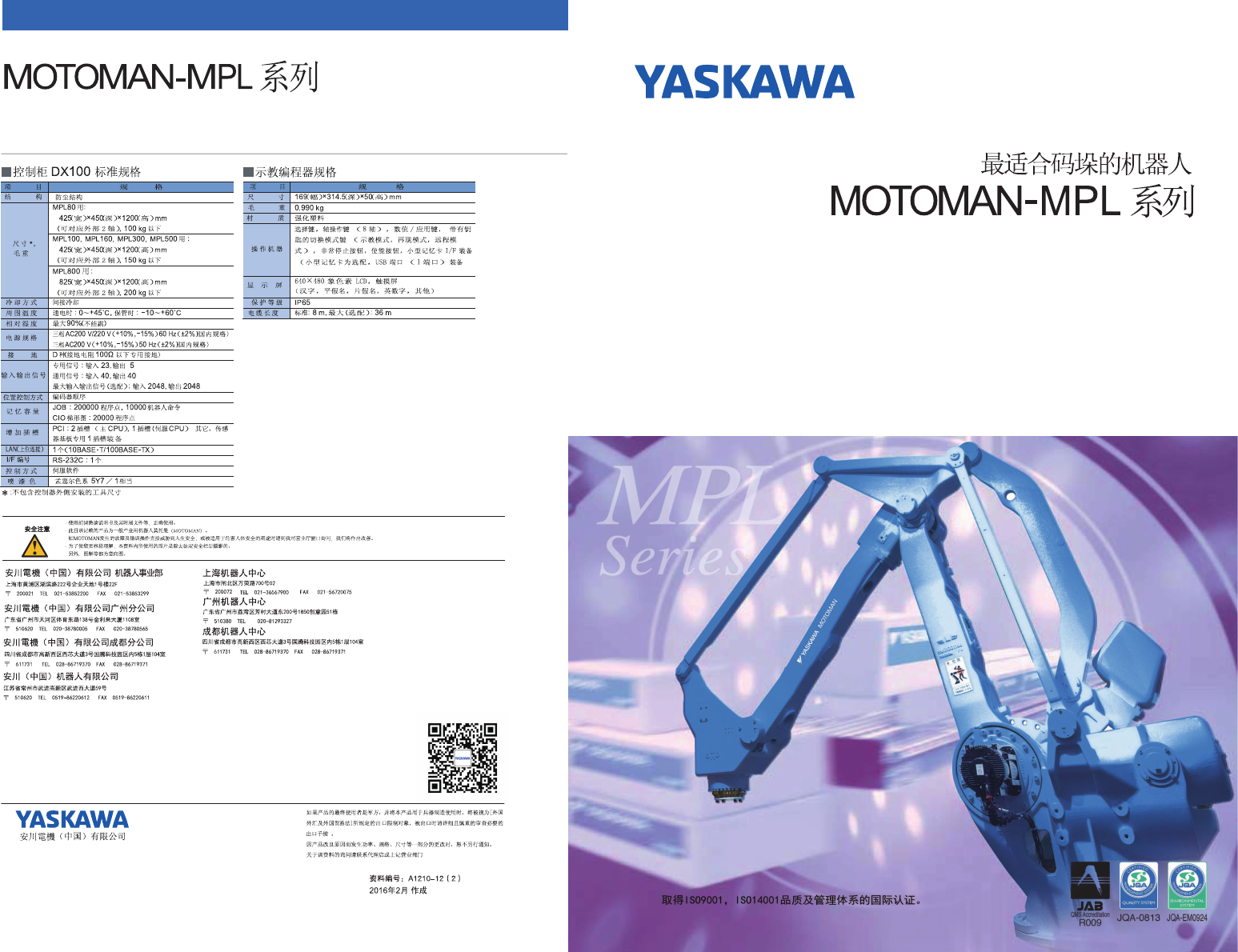 MOTOMAN - MPL 系列 YASKAWA ■ 控制柜 DX 100 标准规格 ■ 示教编程器规格 规 格 MOTOMAN - MPL 系列 169 : 幅 ) > < 314.5 ( 深 ) x 50 ( 高 ) mm 寸 防 尘 结 构 尺 MPL 80 用 : 毛 重 0.990 kg 425 ( 宽 ) x 45 ( X 深 ) x 1200 ( 高 ) mm ( 可对应外部 2 轴 ) , 100 kg 以下…