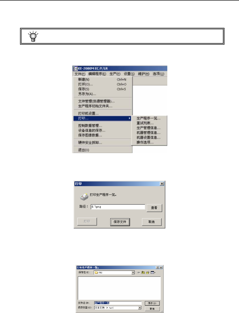 可打印“生产程序一览”,“重试列表”,“生产管理信息”,“机器管理信息”,“机器设置信息”,“操作选项”