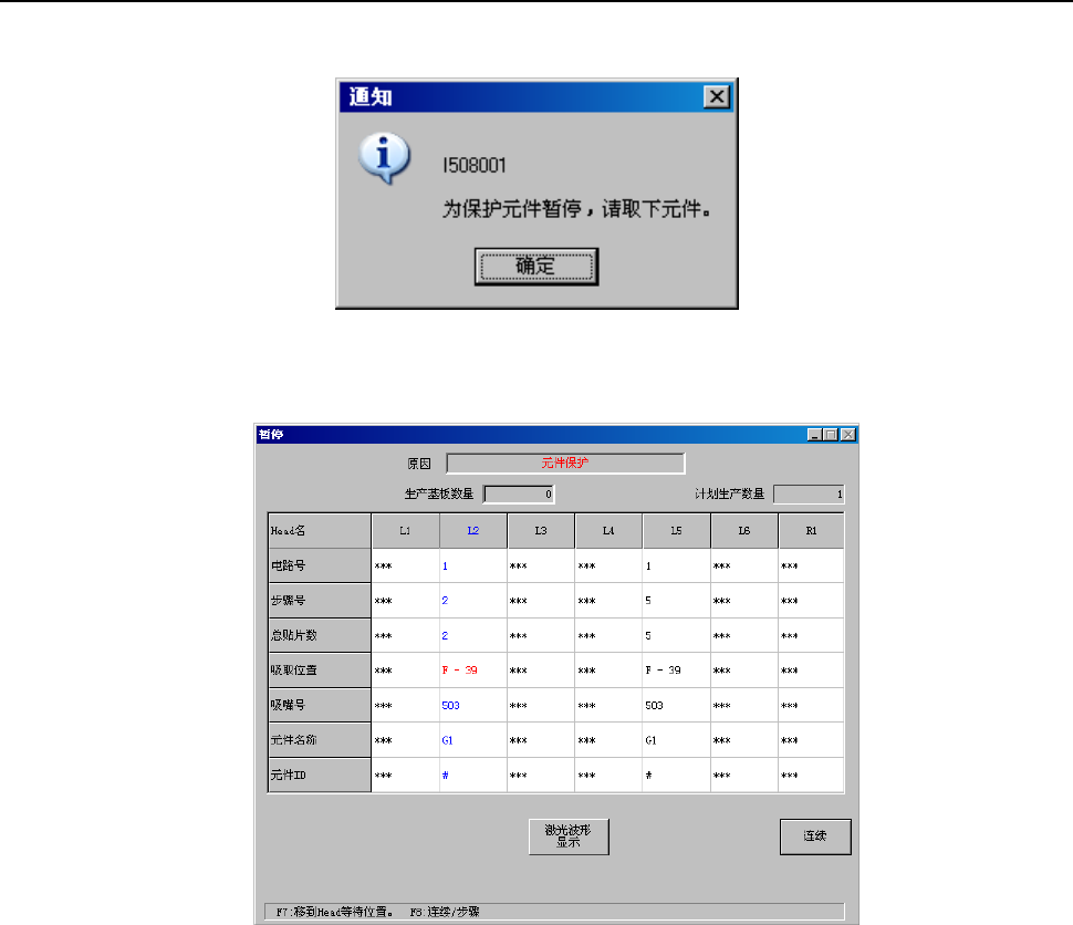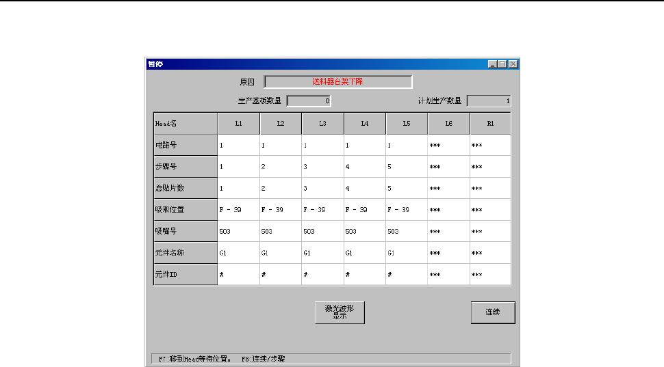 在生产运行中(XY轴移动中)检测出送料器悬浮时,会显示如下信息,并进入暂停状态。
