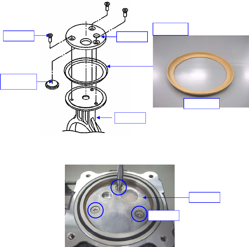 4) 安装了新防止吸气阀碰触胶垫的固定器放置在碗形密封垫圈之上,使用涂抹了螺钉松动防止剂