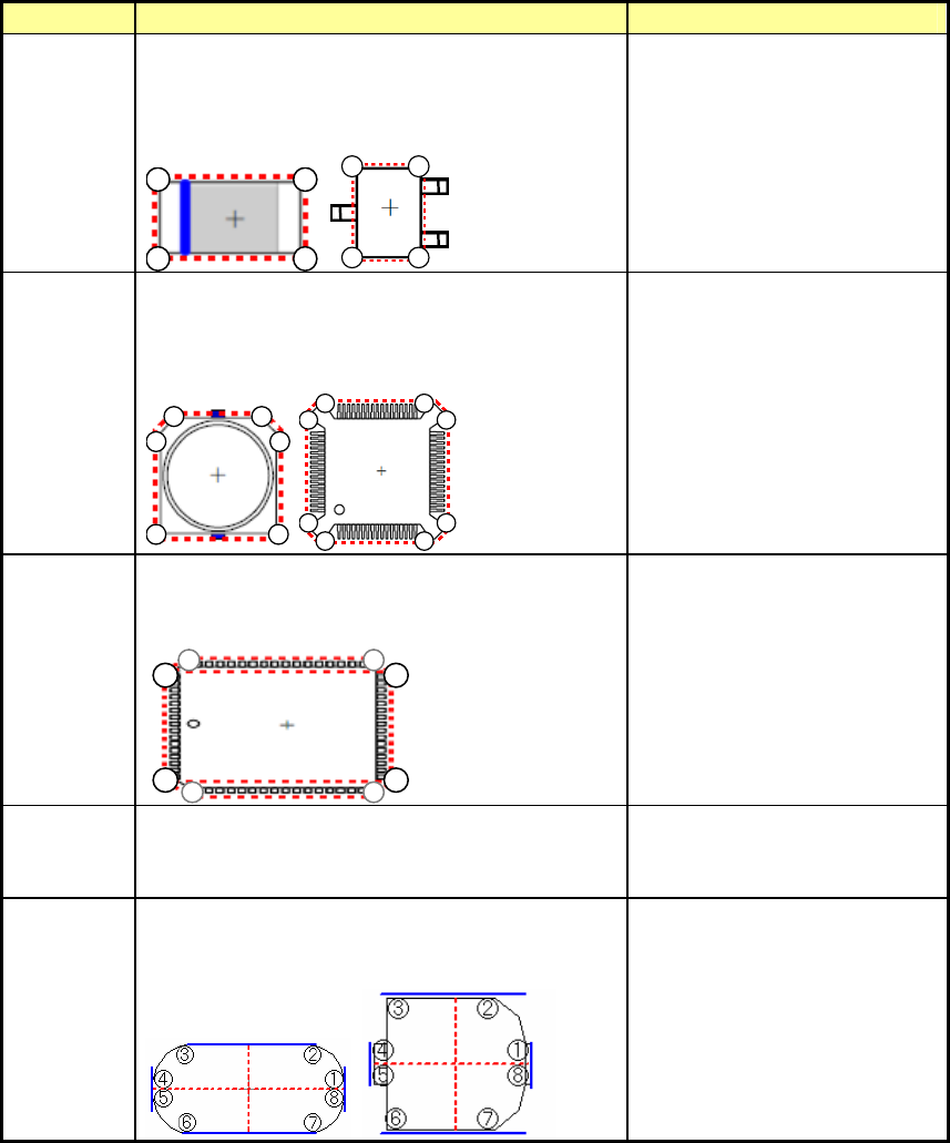 第1部 基本篇 第4章 制作生产程序 4-65 5) 元件形状 可以指定供激光识别用的元件形状。主要用途如下: 表 4-3-5-2-5-2 元件形状 元件形状 动作 用途 无缺角 从测量数据检测出 4 个顶点,进行位置偏差、 角度偏差的计算、校正,并进行贴片。 对于无缺角,近似四边形形状的元件,可设置 此种元件形状。 2 3 4 1 2 1 3 4 芯片、 圆筒形芯片、 SOT、 QFN、 微调电器、 单向连接器、 双向 连接器、Z 引…