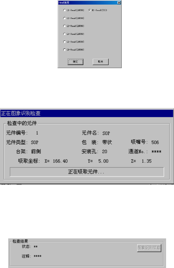 第1部 基本篇 第4章 制作生产程序 4-192 (4) Head选择 MNVC 功能设定有效时,可选择检查使用的贴片头。 按下选择贴片头的按钮后,可显示贴片头选择对话框。 但若被检元件不能使用左贴片头时,不会显示贴片头选择按钮(显示出使用的贴片头为右 贴片头。 )按下[Head 选择]按钮后,会显示如下[选择贴片头对话框],请从中选择。 (5) 正在图像识别检查画面 在图像识别检查中会显示如下画面。显示进行检查的元件内容/吸取位置, …