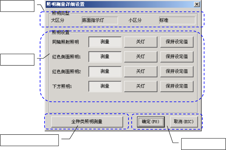 ● 照明设置(F9):可设置详细的照明条件。按下按钮后,显示设置照明检测的详细对话