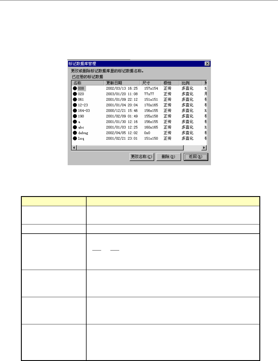 列表中显示数据库储存的标记数据。各项目的含义如下。