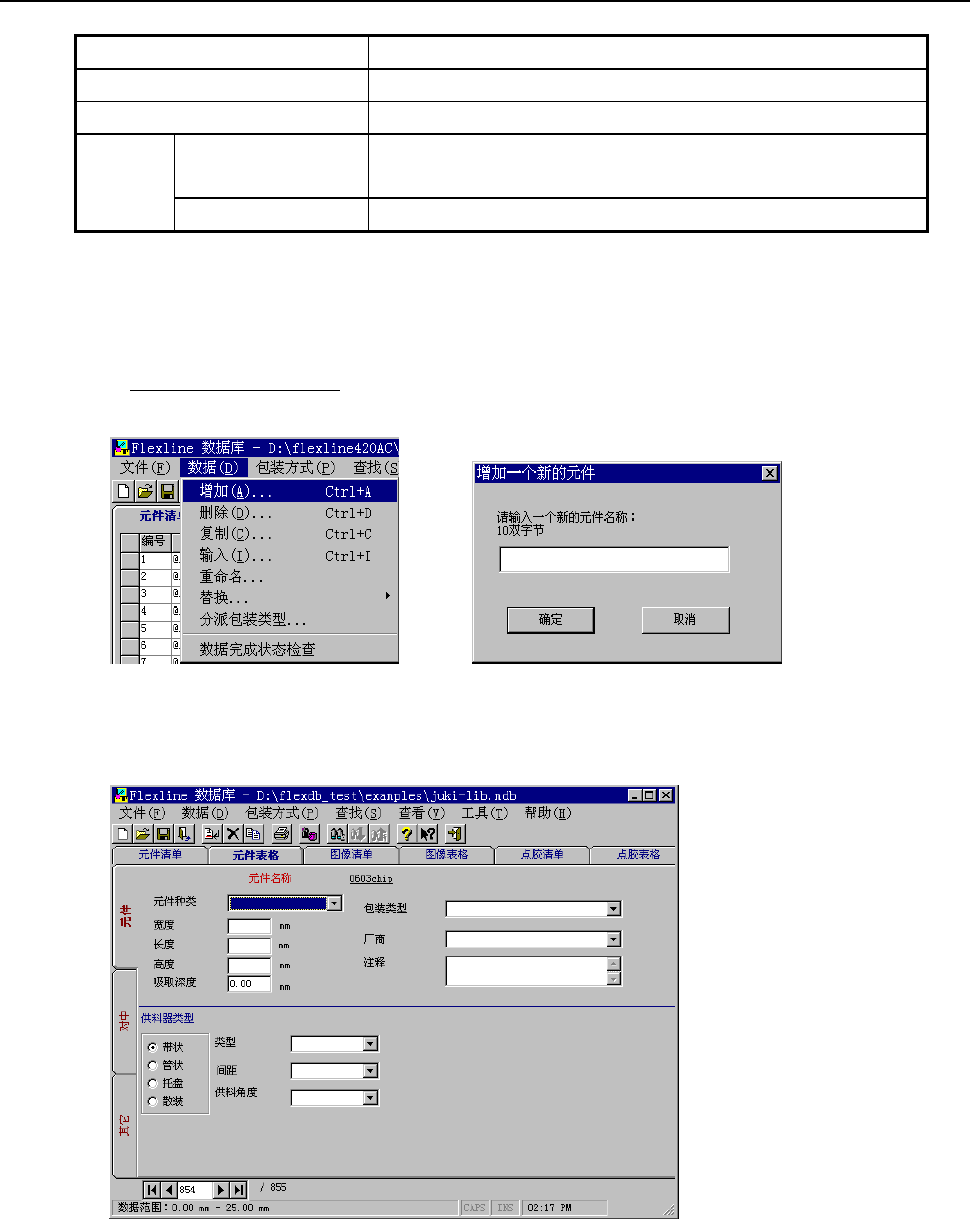 第1部 基本篇 第5章 数据库 5-9 5-1-3 制作与编辑元件数据(包括图像数据) 新建、编辑元件数据的方法有以下几种。 设定项目 内 容 增加 新输入元件名,制作元件数据。 复制 不改变已经制作的元件数据内容,仅用其他名复制。 在数据库中注册 将生产程序文件、 或已注册到其它数据库的元件数据全部统 一注册到数据库。 注册 在程序编辑中注册 将生产程序文件的元件数据逐一进行注册。 5-1-3-1 增加 新建元件数据。 <步骤&…