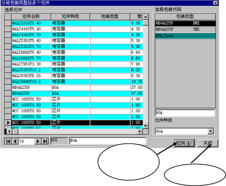 4) 选择元件数据和包装类型、按“应用”按钮后,可把包装类型分派到所选择的元件数据上。要关