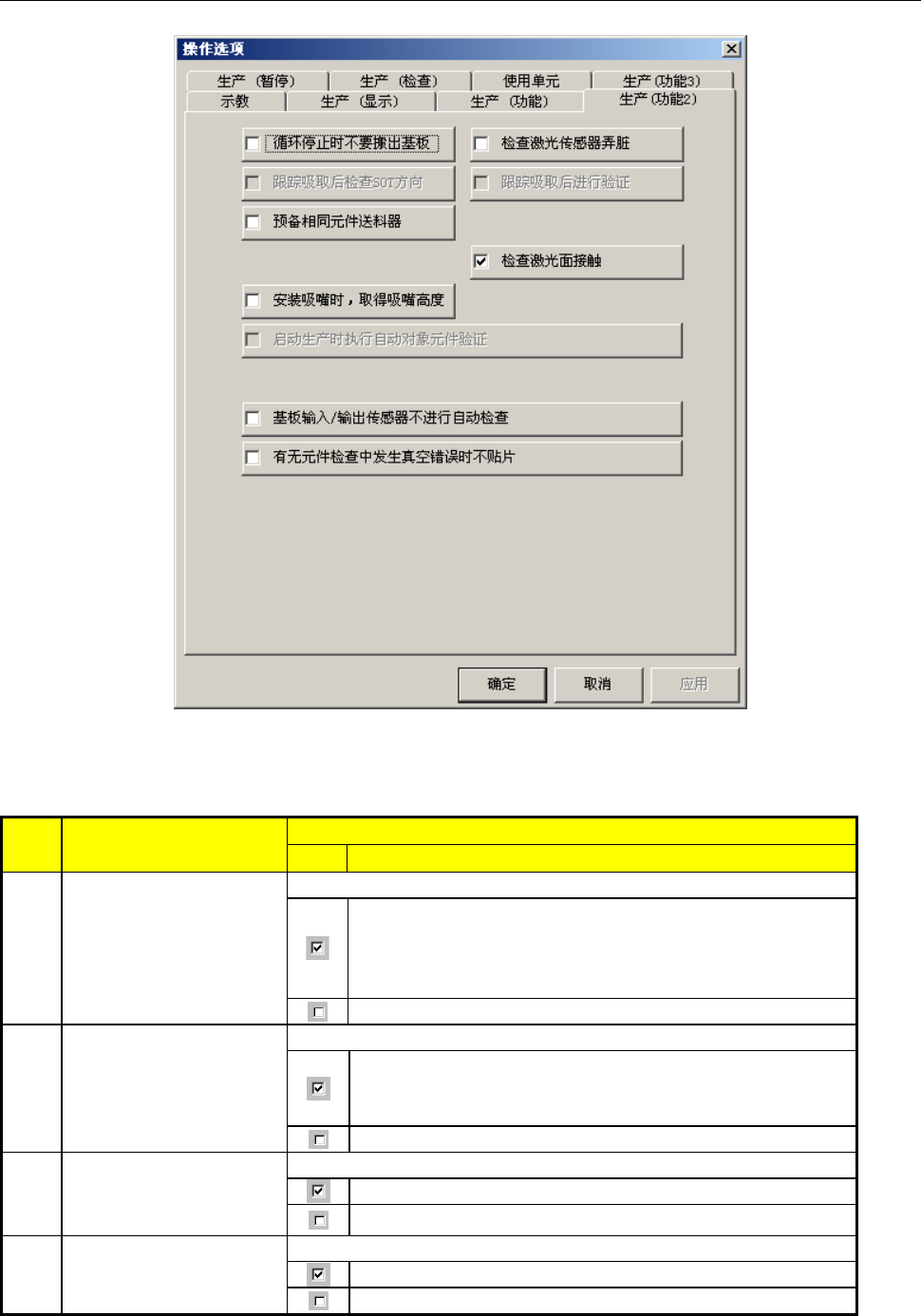 第2部 功能详细编 第7章 操作选项 7-8 7-2-4 生产的功能 2 选项的设置 设置生产时的操作。 图 7-2-4 生产功能 2 选项 表 7.2.4 生产功能 2 选项设置项目的详细内容 序号 项目 内容 状态 动作及详细内容 1 循环停止时不要搬出基 板 设置在循环停止时是否搬出基板。 在生产中按下单循环键时, 生产一块基板后不搬出基板 , 留 在中心站上。 ·释放基板并暂停。 ·按<START>键,再进行生产。 …