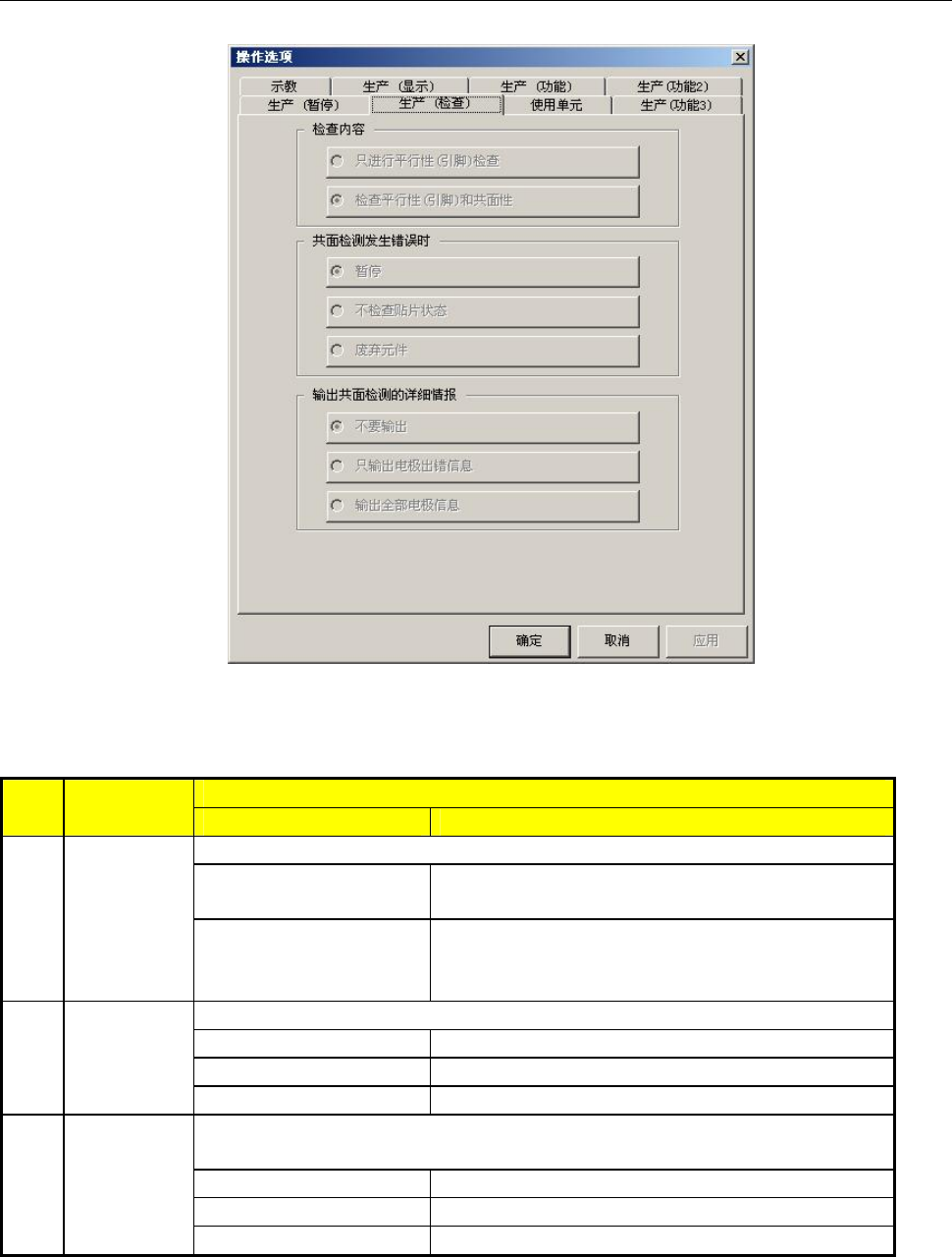 第2部 功能详细编 第7章 操作选项 7-12 7-2-6 设置生产时的检查选项 设置共面(选项)。 图 7-2-6 生产时的检查选项 表 7-2-6 设置生产中的检查选项的细节和内容 内容 序号 项目 1 项目 2 动作及详细内容 选择共线性检查内容。 只进行平行性 (引脚) 检 查 对引脚所在各边单独实施引脚悬浮检查。 检查所有引脚的上下方向弯曲。 1 检查内容 检查平行性 (引脚) 和共 面性 以共线性检查所获取的数据为依据, 制…
