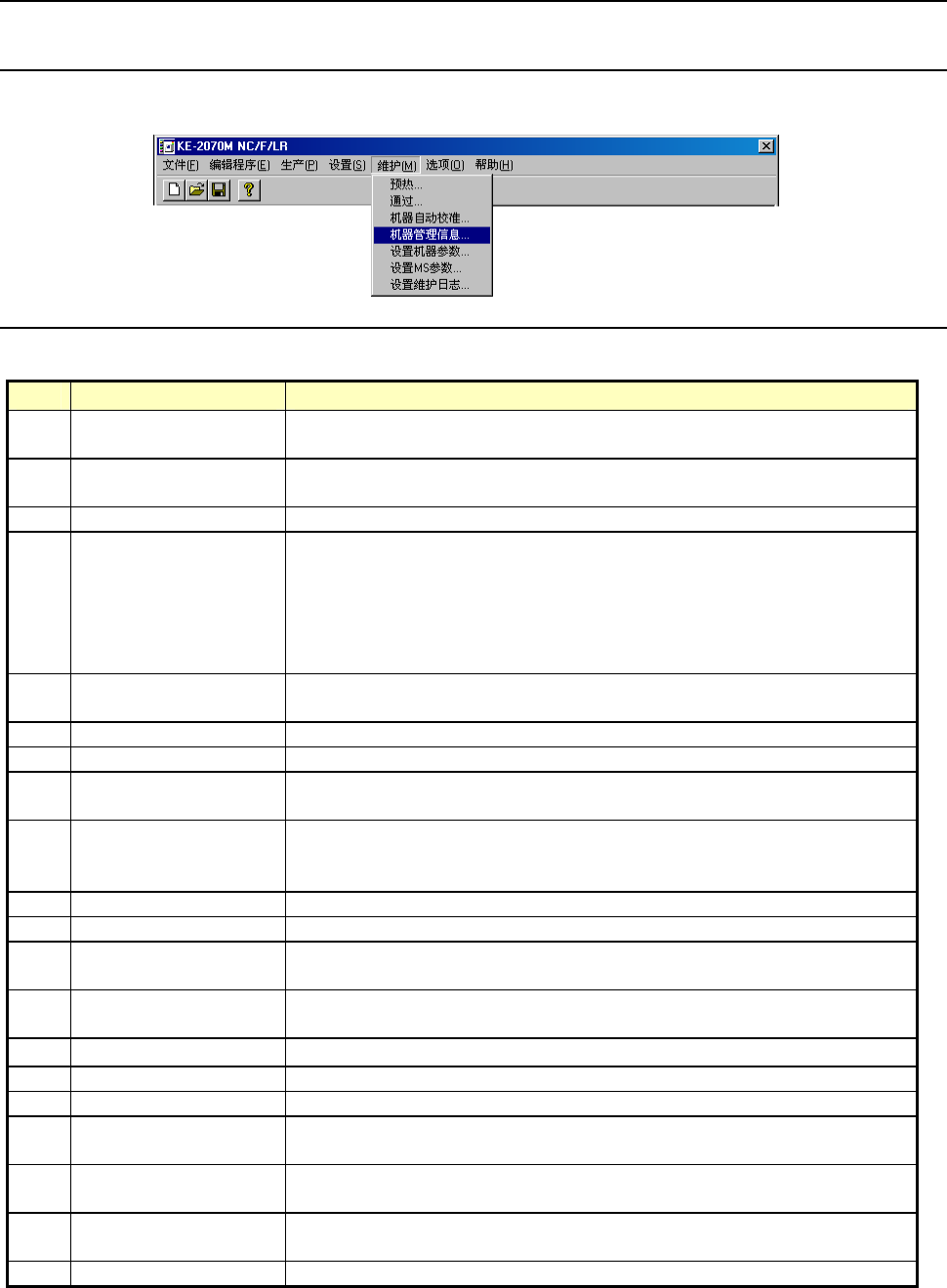 通过从主画面的菜单栏中选择“维护”/“机器管理信息”,可选择如下的运行信息。