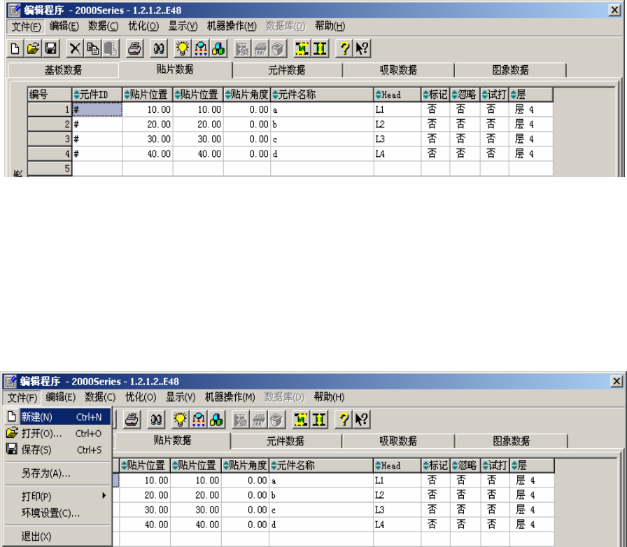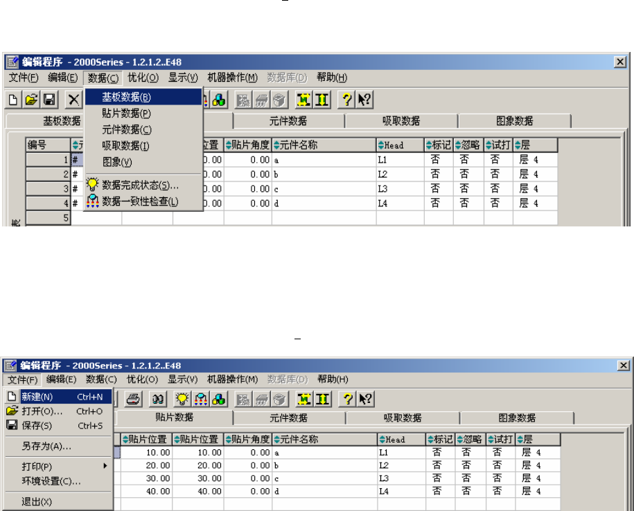 第 1 部 基本编 第 1 章 设备概要 1-61 ② 使用快捷键 按菜单上显示的下划线字母(如[文件]中的“F”)便可选择并执行该项。 先用[Alt]键激活菜单栏,再按下[C]键,则显示[数据]下拉菜单。再按下[P]键,就可执行[贴片数据]。 图 1-3-3 -4 用快捷键来选择菜单 此外,在下拉菜单内,如果项目右侧显示有组合键,即使不激活菜单栏亦可直接执行。 菜单未激活时,可按[Ctrl+O]键执行 [打开...(O )] 图 1-…