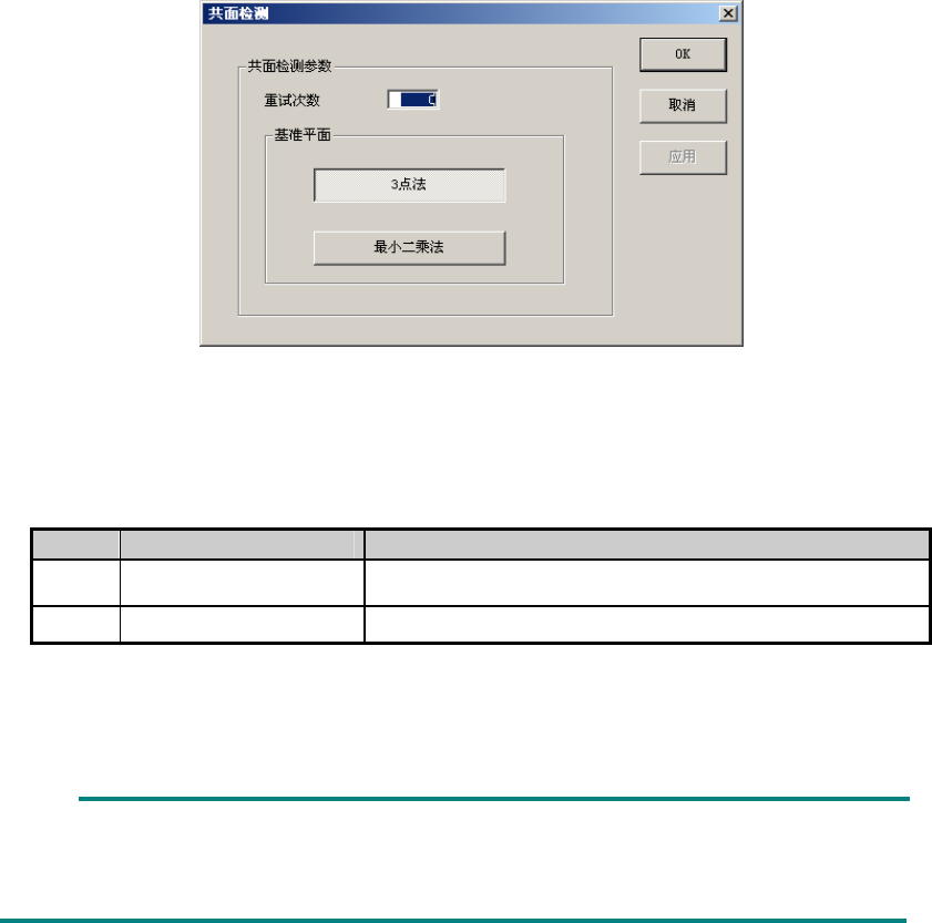 第2部 功能详细篇 第1 2章 选项组件 12-30 2) 在菜单栏中,选择“设置各组”/“共面检测” 。 图 12-9-4-3 共面 请指定重试次数和基准平面。 序号 项目 要设置的内容 1 重试次数 为了取得共面检测参数而反复进行的次数 2 基准平面 选择基准平面用 3 点法还是用最小平方法 详情请参见“8-5-10-12 共面检测”。 ◆ 球元件 :与基准面的设置无关,用最小平方法执行计算。 ◆ 单向插头 :与基准面的设置无关…
