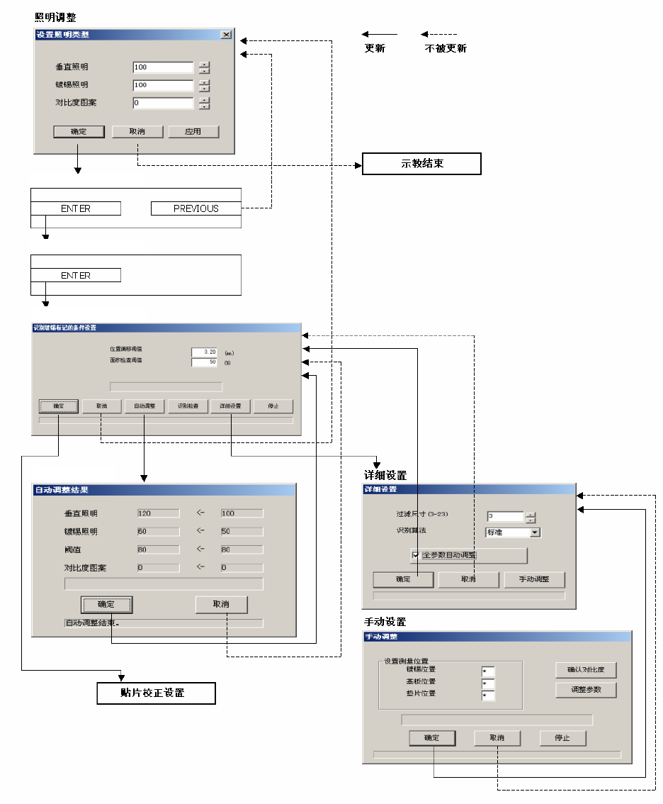 选中[全参数自动调整]进行自动调整时,照明、阈值、对比度图案会一边变动,一边进行全部图