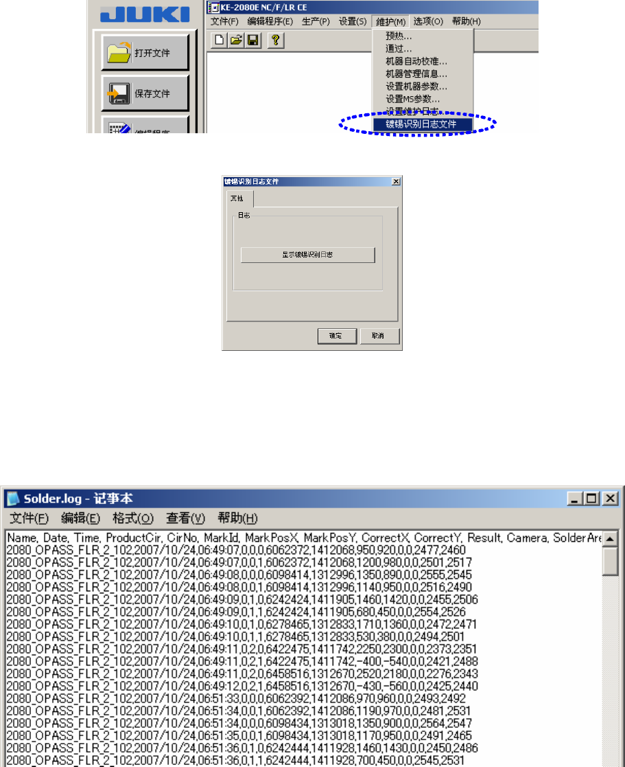 按下[显示镀锡识别日志] 按钮时 以文本格式(文件名”Solder.log”)保存,之后再显示。