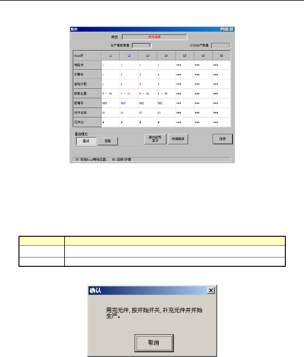 忽略 忽略发生错误的元件的吸取贴片循环,从下一个吸取循环重启生产。