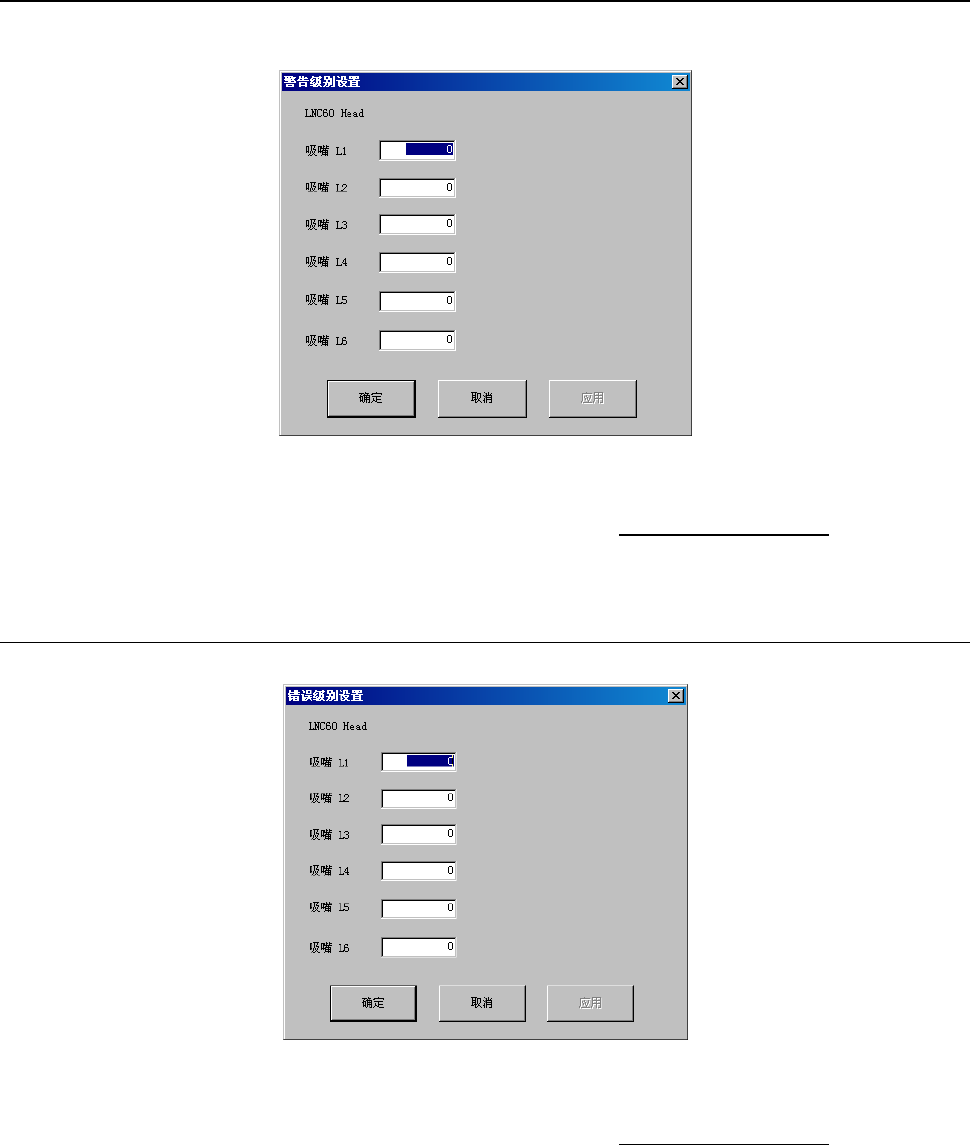 第 2 部 功能详细篇 第 10 章 设备运行信息 10-12 10-4-3 设置警告级别 可设置各Head的警告级别。 从菜单栏中选择“工具”/“警告级别设置”/“各Head”,则显示图10-4-3-1。 图 10-4-3-1 设置警告级别 ◆ 如果吸嘴更换次数超过设置次数,则“图 10-4-1-1”中的相应吸嘴变为黄色显示 。 信号灯的亮灯状况不变。 10-4-4 设置错误级别 从菜单栏中选择“工具”/“设置错误级别”/“各Head…