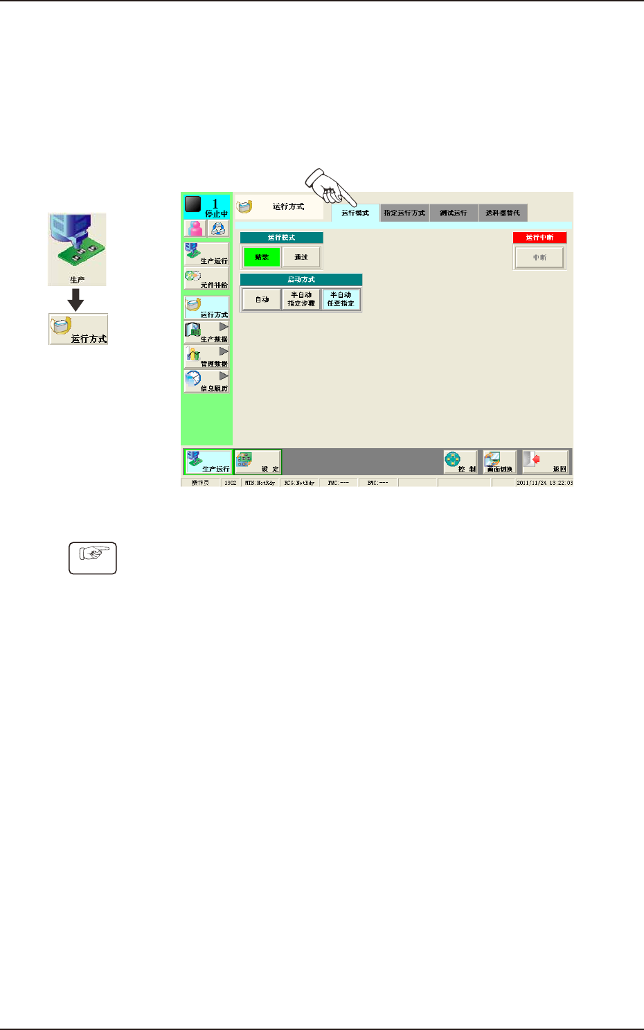 1OM-1752 3-21 2.3 生产机种的切换 2.3.1 运行模式的选择 在 “ 运行方式 ” 界面设定运行模式。 通常选择 “ 贴装 ” 。 F1C19 Procedure (1) 在 “ 运行方式 ” 界面中,按下 [ 运行模式 ]Tab。 (2) 按下 “ 运行模式 ” 中的 [ 贴装 ] 按钮。 1304-001 界面展开 2.3 生产机种的切换