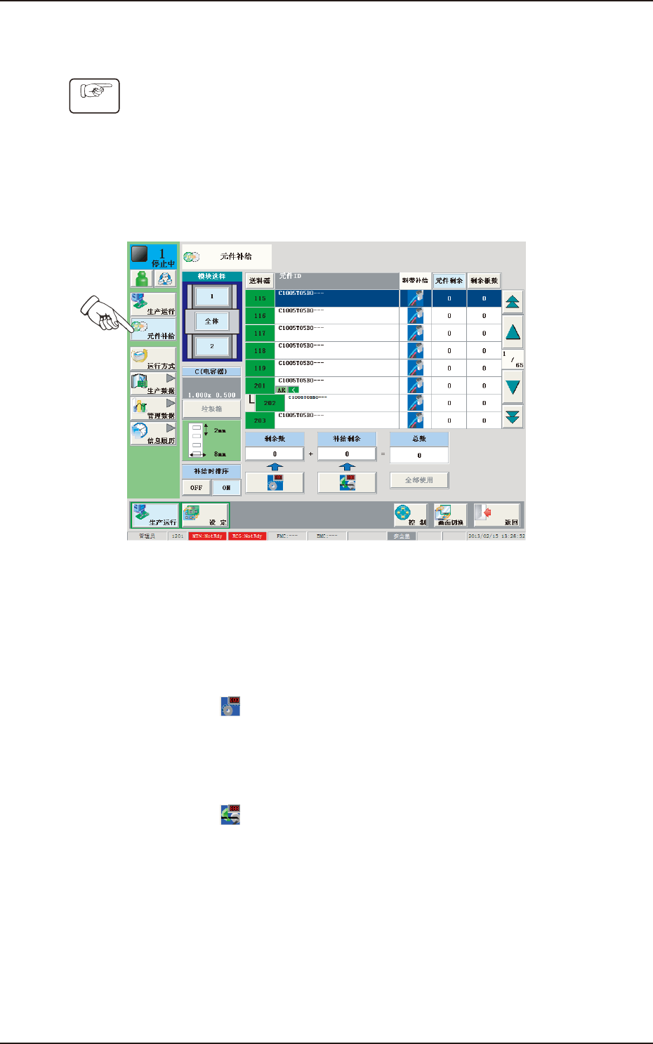 (2) 在生产运行主界面中,按下 [ 元件补给 ] 按钮,切换到