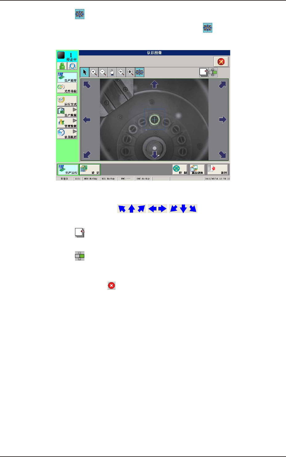 1OM-1752 2-13 1304-001 2.2 识别界面 [ ] 按钮 : 图像目视对齐模式 单一显示识别图像后,按下 [ ] 按钮,便显示 图像移动按钮。 F1B9 图像移动按钮 ( 按钮 ) 向选择按钮的箭头指向移动图像。 [ ] 按钮 : 切换按钮 进行正反面判定、极性判定的图像切换。 [ ] 按钮 : 多重模式显示按钮 切换到多重显示界面。 [3] 关闭按钮 ([ ]按 钮) 关闭目视对齐模式的识…
