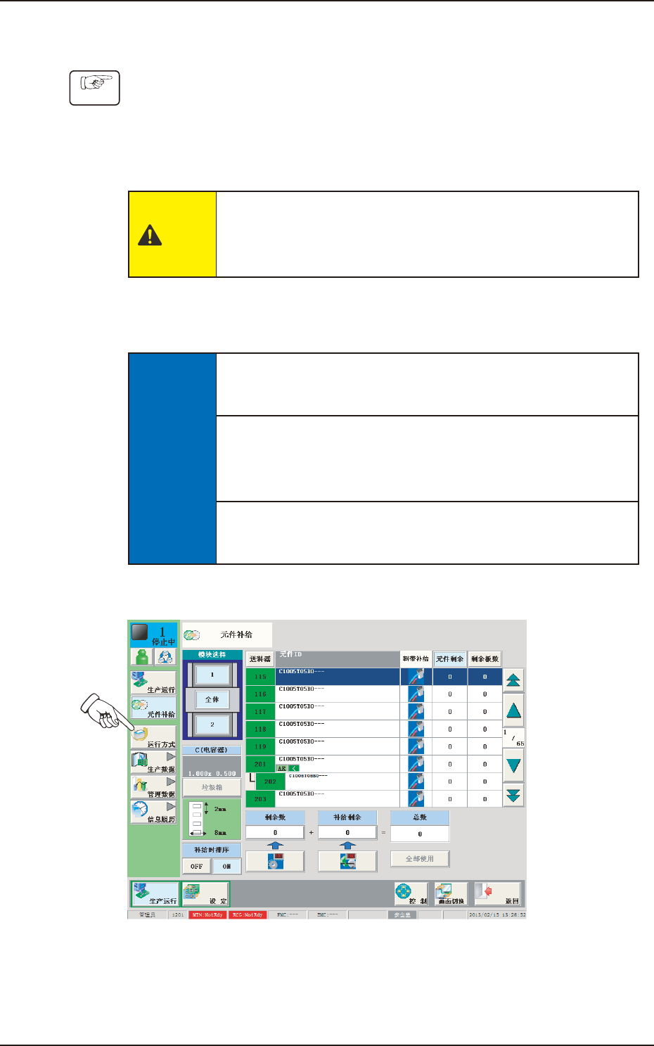(4) 按下生产运行菜单中的 [ 元件补给 ] 按钮,切换到