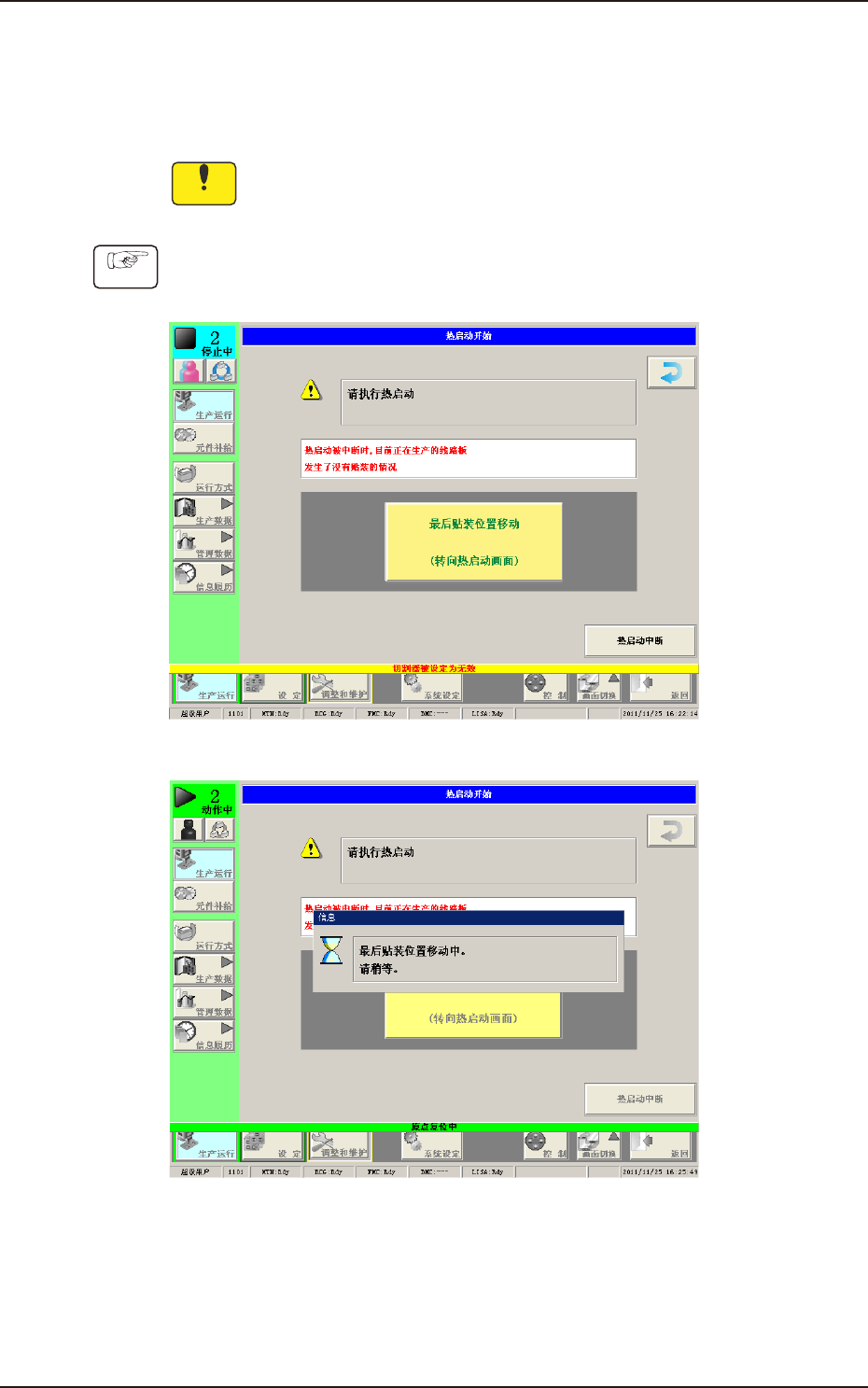1OM-1752 3-48 (2) 确认各安装头的最终贴装元件是否被贴装。 F1C45 (3) 选择元件的有无。 ( 在线路板有元件时选择 [ 元件有 ] 按钮,在线路板没有元件时选择 [ 元件无 ] 按钮。) (4) 按下 [ 热启动开始 ] 按钮,开始热启动。 Note 若有未设定元件有无设定的安装头时,不能开始热启动。 (5) 确认通过热启动生产的线路板的所有元件是否被正常贴装。 1304-001 5.3 热启动下的重新开始生产