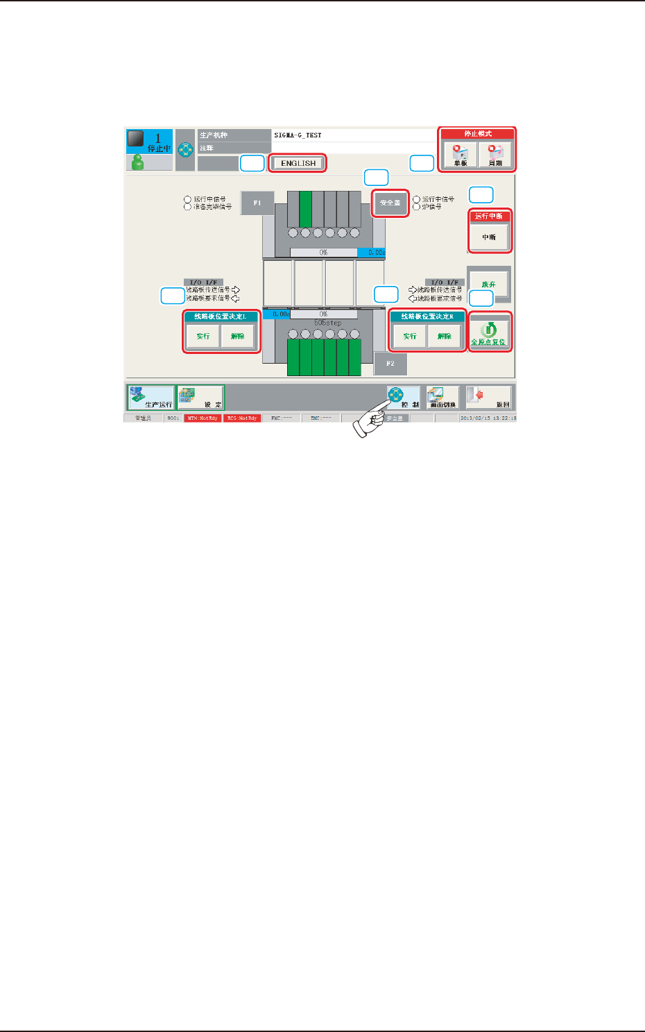 1OM-1752 2-7 1304-001 [设 定]按 钮 显示 “ 设定 ” 界面。 Reference 关 于 “ 设定 ” 界面请参照 “ 第二卷第六章设定菜单 ” 章节。  [控 制]按 钮 显示 “ 控制 ” 界面。 Reference 关 于 “ 控制 ” 界面请参照 “ 第二章2.1控制菜单 ” 章节。  [画 面(界 面)切 换]按 钮 切换到识别图像的显示界面。 Reference 关 于 “ 识别…