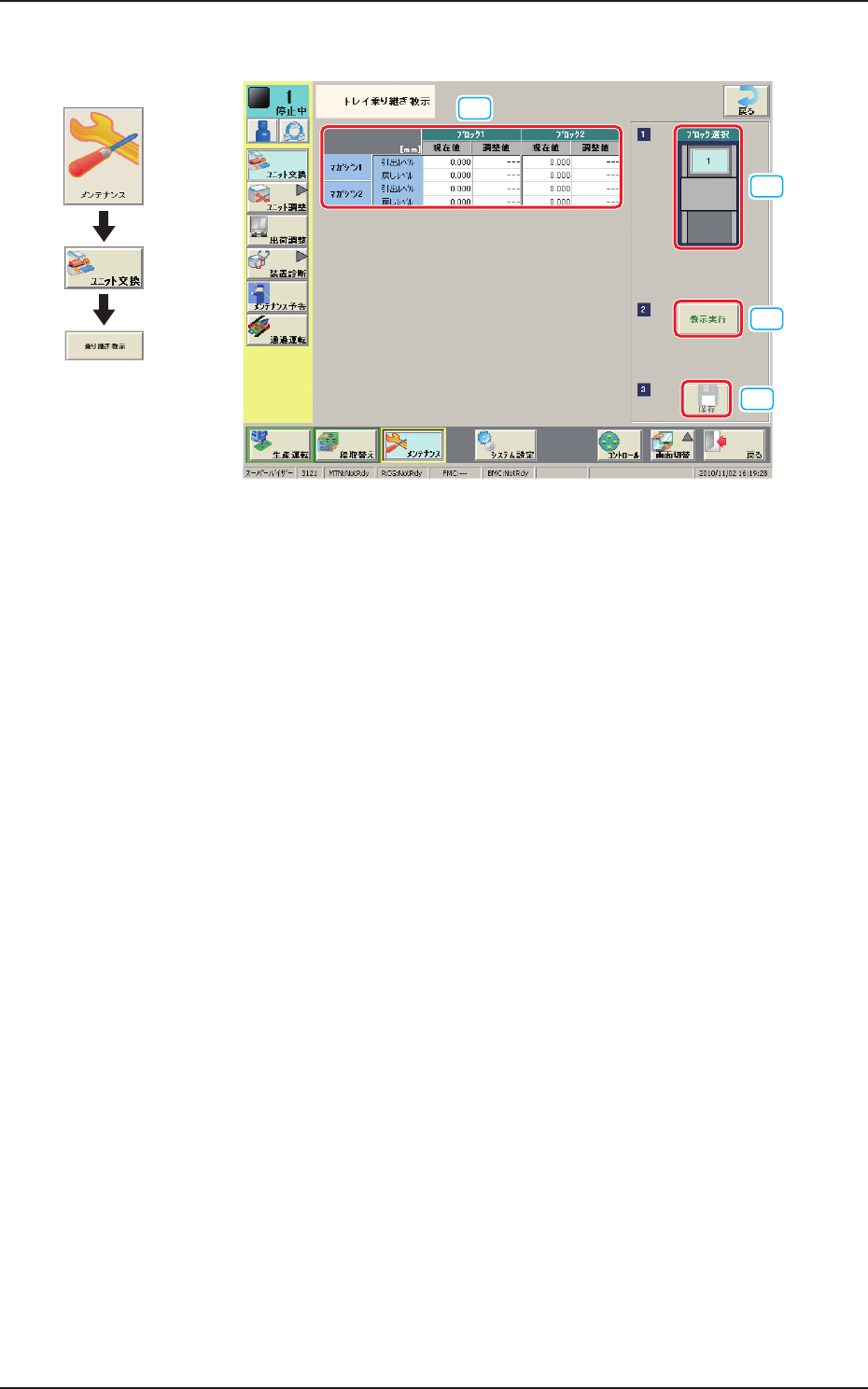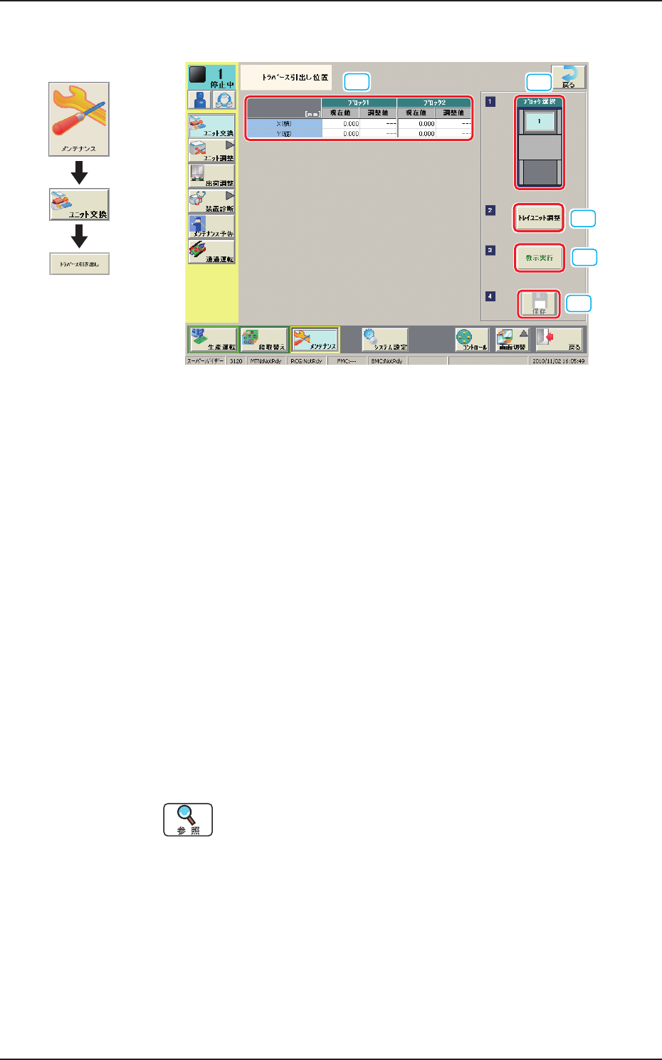 OM-1753 3-8 1303-001 1.2.3 トラバース引き出し位置 [1] [2] [3] [4] [5] “トラバース引き出し位置” FC8 [1] ブロック選択 設置されている多段トレイフィーダのブロックを選択できます。 [2] トラバース引き出し位置補正 トラバース引き出し位置の吸着位置補正の値が表示されます。 現在値 : 教示前の値 調整値 : 教示を行った結果です。 [3] [ 教示実行 ] ボタン 吸着位置を教示し…