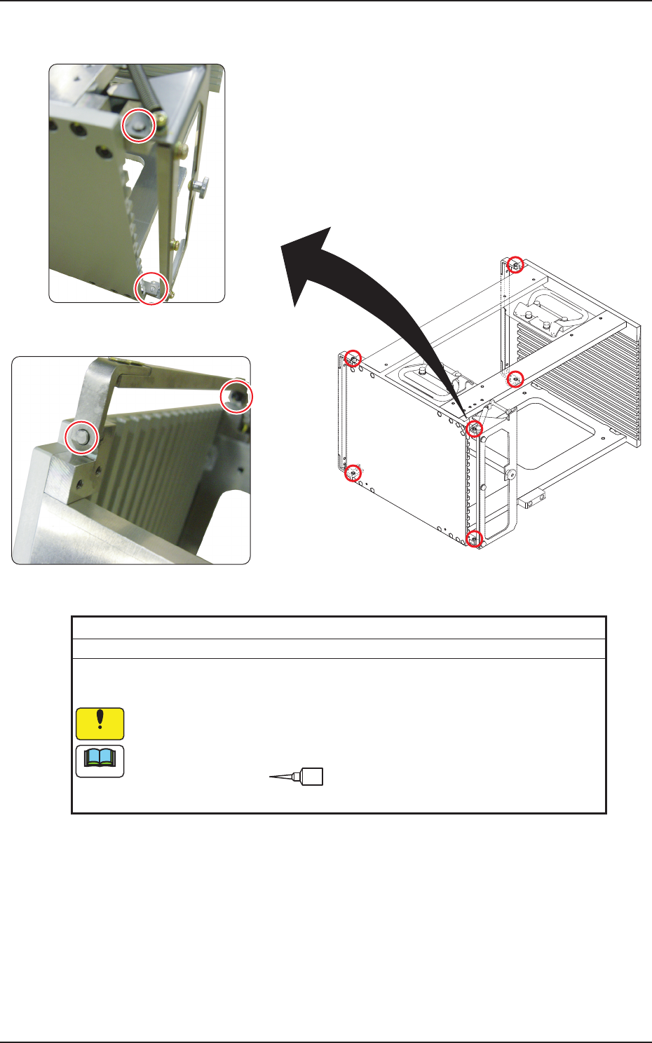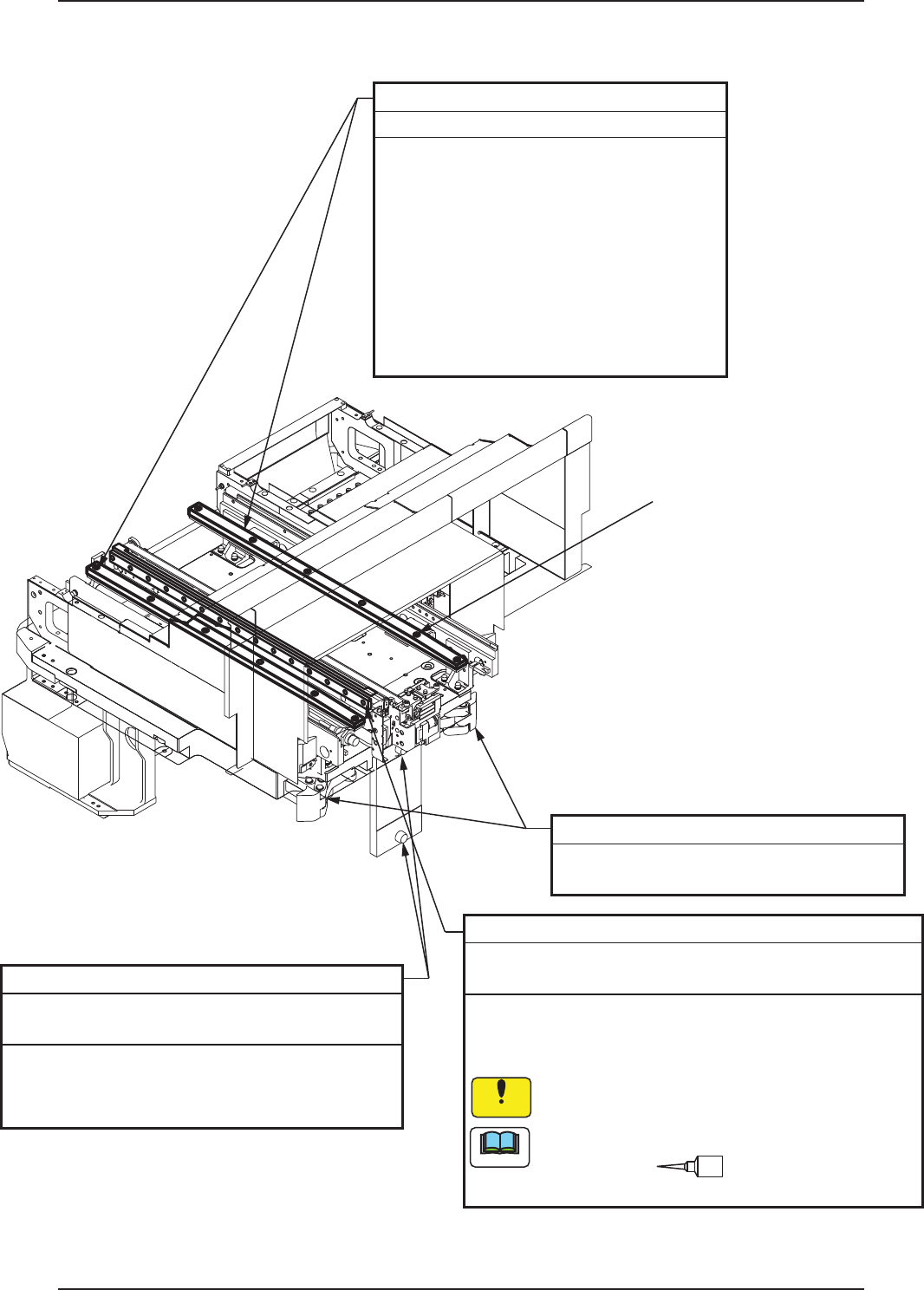 OM-1753 4-19 3.2.5 トラバースカート リニアガイド 3か月ごと 給油 (ダフニーエポネックスグリースNo.1) 油ウエスで古いグリースを拭き取って、 リニアガイド ブロックの給油穴に新しいグリースを シリンダで40cc注入してください。 パレット受け 3か月ごと 点検 パレット受けの磨耗を目視でチェック します。 パレットがたわむくらいに磨耗してい る場合は、以下の手順で交換してくだ さい。 1. パレット受けのボルト…