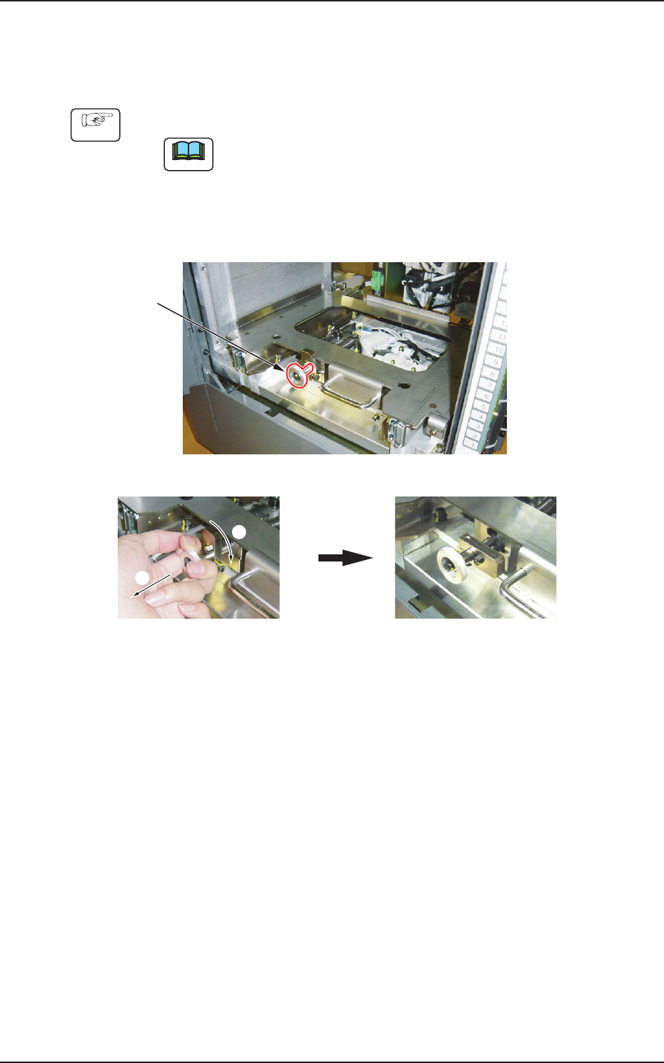 OM-1753 1-17 3.4.3 マガジンの交換 • マガジンの取付け手順 手順 (1) 準備完了スイッチの LED が消灯していることを確認し、扉を開ける。 ノート 準備完了スイッチの LED が緑色に点灯しているときは、扉を開ける ことはできません。 (2) マガジンストッパのつまみを手前に引っ張りながら、時計回り方向 へ約 90°回す。 つまみ つまみを手前に引きながら、時計回りに約90°回します。 2 1 マガジン搭載部 F…