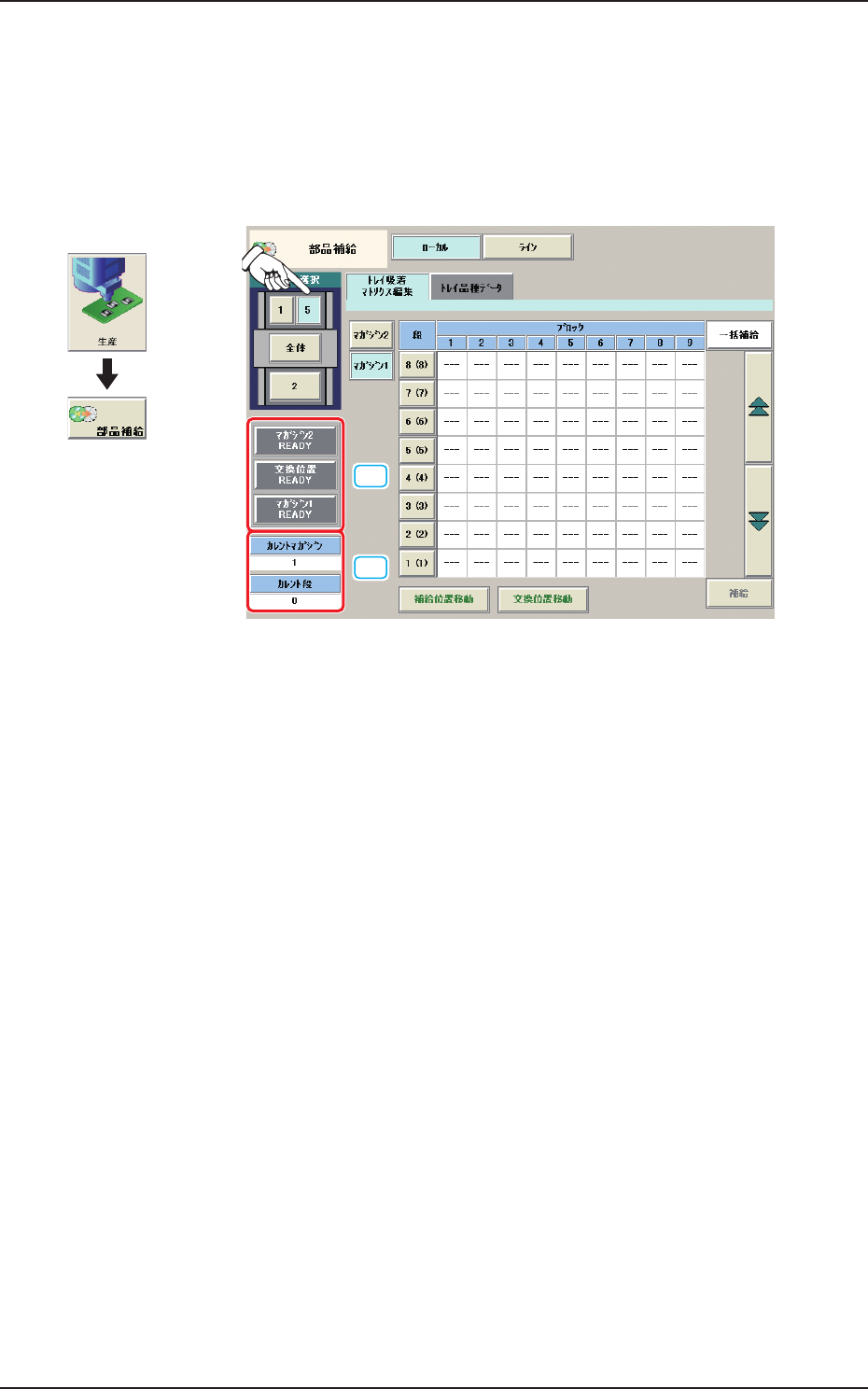 部品補給した段を選択し、[ 補給 ] ボタンを押すと、選択された段の