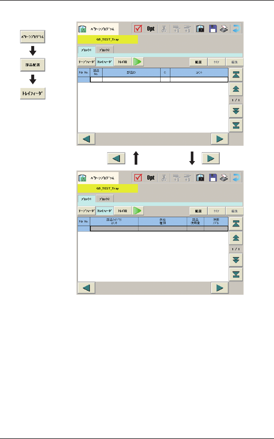 OM-1753 2-19 1303-001 (F02_01) Fdr No. 部品配置データのフィーダ番号を示します。 多段トレイフィーダを設置した場合の Fdr No. は以下になります。 多段トレイフィーダ 1 : 501 ~ 599 多段トレイフィーダ 2 : 601 ~ 699 多段トレイフィーダ 1 多段トレイフィーダ 2 501 ~ 599 601 ~ 699 装置後面 装置前面 多段トレイフィーダ 1、2 使用時 FB18…