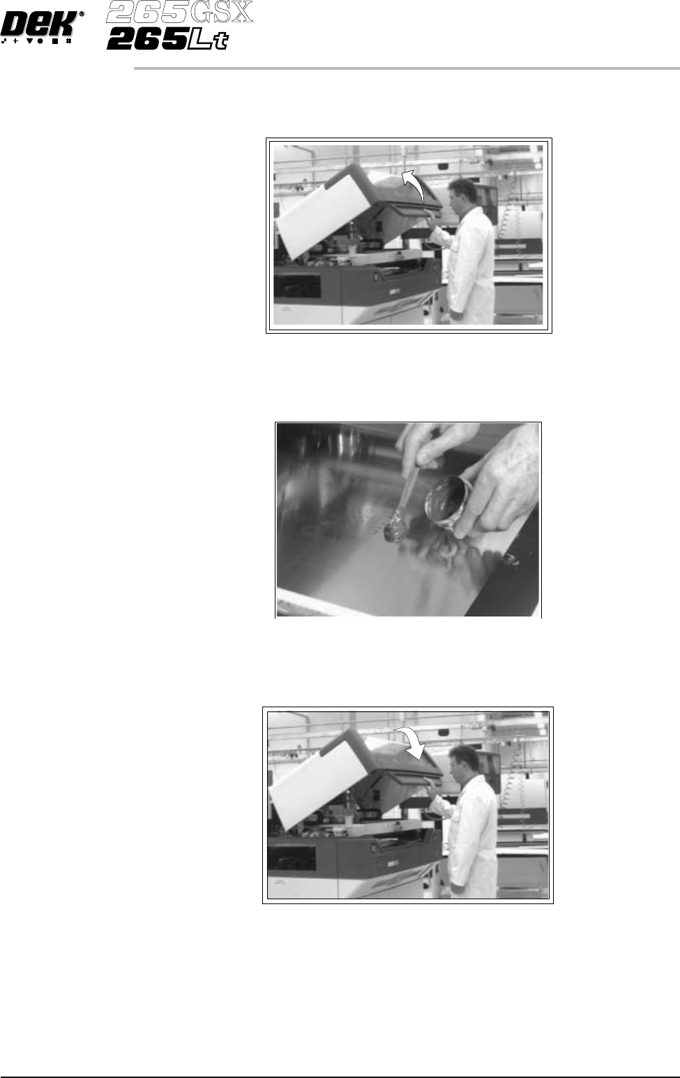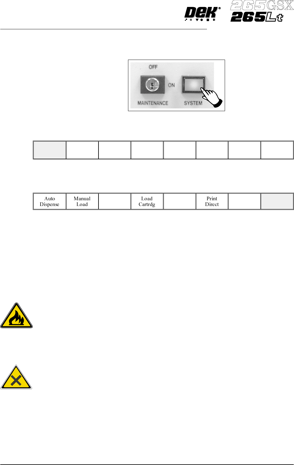 6. Press the System button. 7. Press Continue (F1). Continue 8. Press Exit (F8). Exit Paste Removal During continuous printing operations paste residue build up may occur with the same screen in use and with the squeegee…