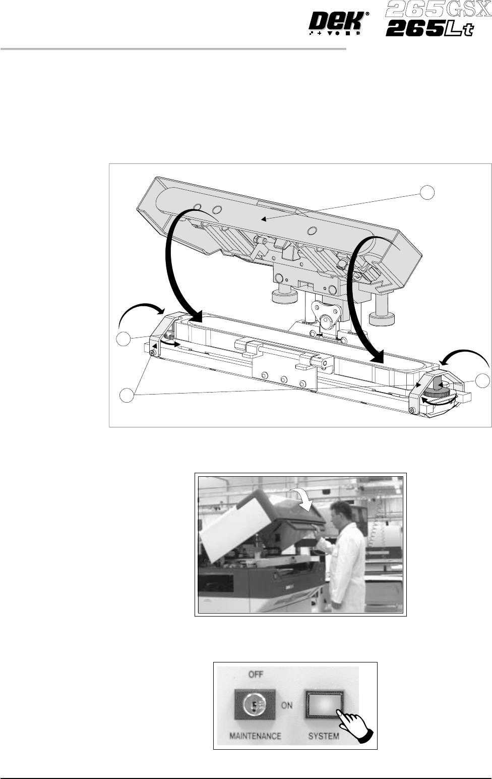 25. Remove the sealing foil from the top of the new ProFlow cassette. 26. Hinge the clamp brackets (1) inwards to position the cassette onto the transfer head, secure in place by tightening the thumbwheels (2). 27. Lower…