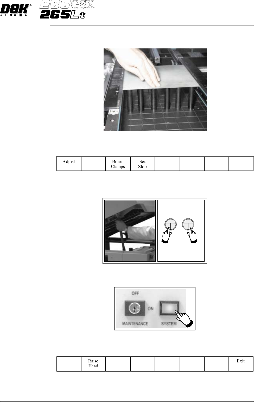 25. Select Raise Head (F2). Raise Head 26. Raise the printhead using two button control. Fit the head prop. 27. Select Board Clamps (F3), to open the clamps. Board Clamps 28. Remove the board from the rails. 29. Select H…